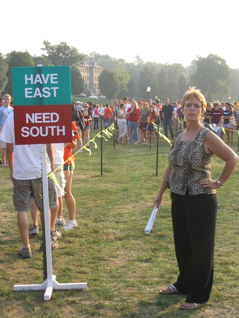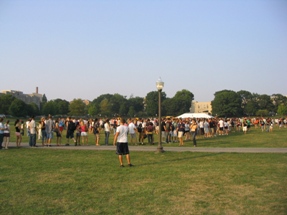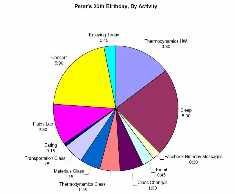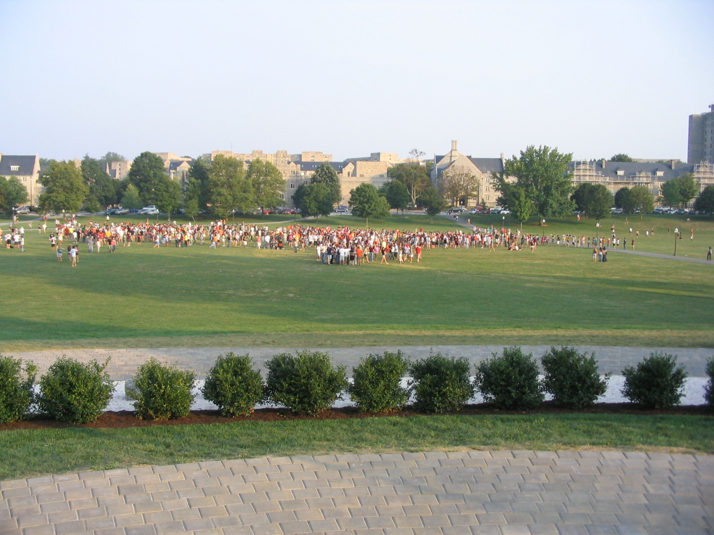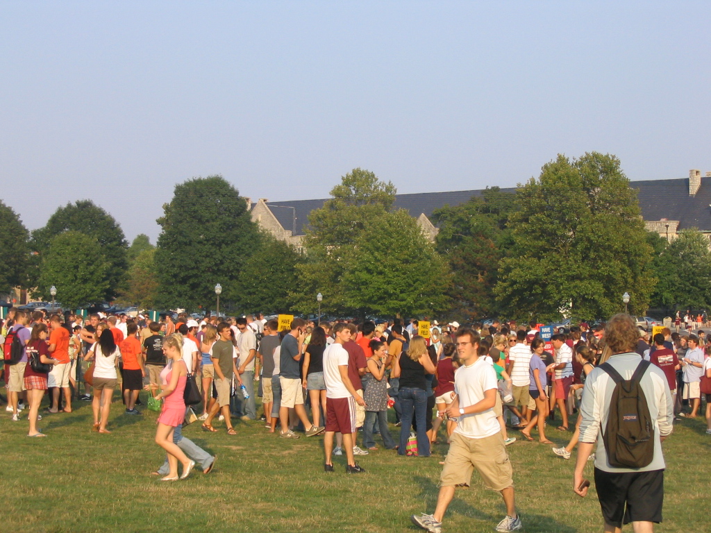My birthday this year was really quite busy... check out the pie chart. I had a bunch of classes in a row, then a big lab, and then Dave Matthews had to go on ahead and foul everything up by deciding to hold a concert in support of VT that evening as well. Sheesh. Anyway, the concert was to be held in the football stadium so everybody could get tickets. However, seating was done in 4 general sections so they had a big swap meet on the drillfield to sort it all out. It was crazy. |