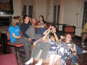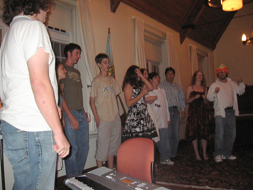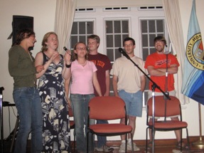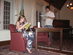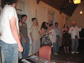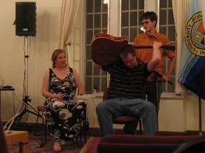 | In no time flat, it was once again time for a coffeehouse. Here, the host, immediate past host, and a hanger-on discuss the upcoming event. | ![]() |