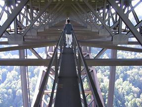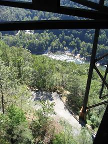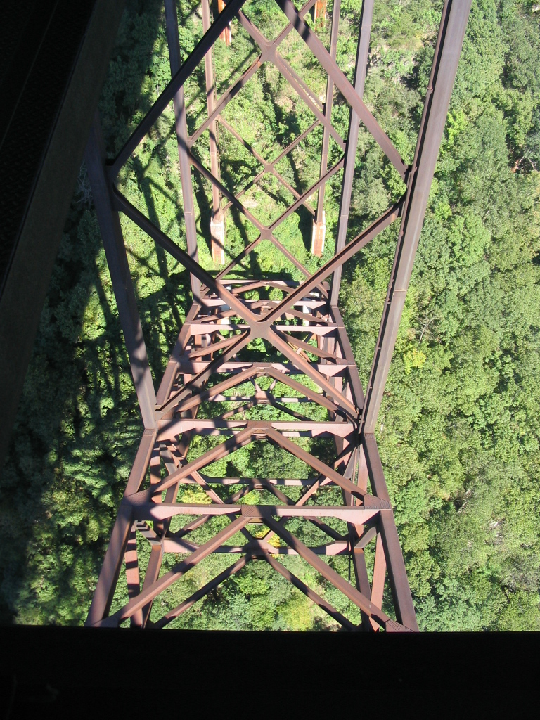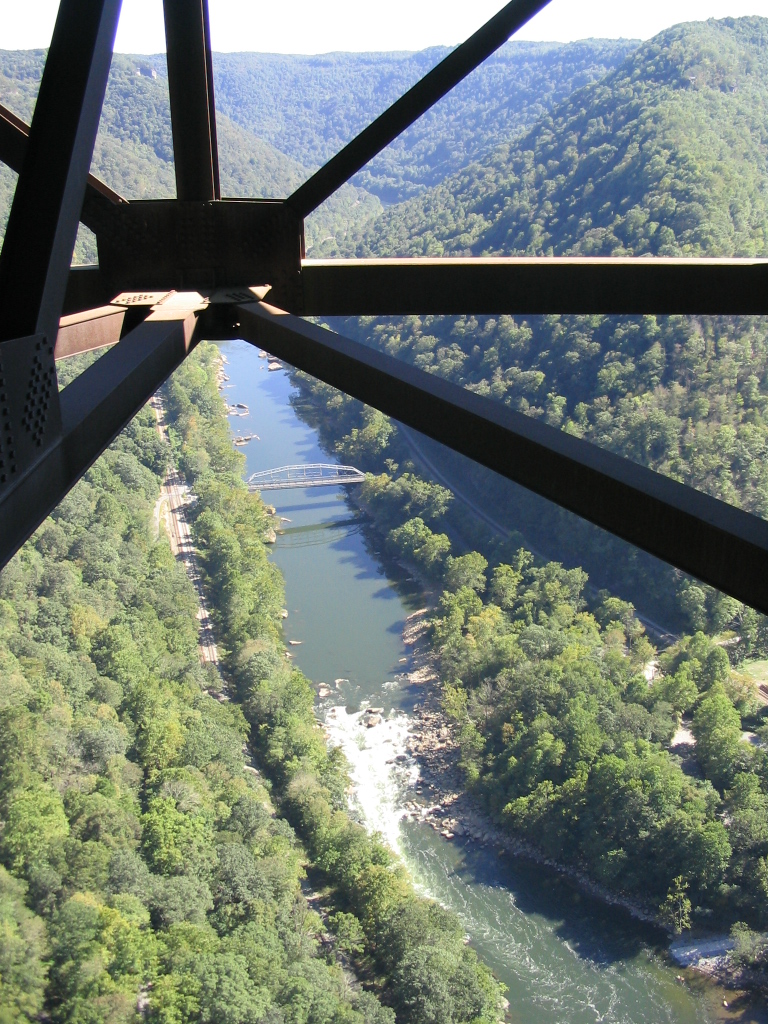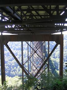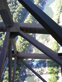 | ...Which is exactly what you realize when you look straight down. This picture was taken near the center of the bridge, and we are looking at Flea Picker rapid (Class III) 870 feet below. |