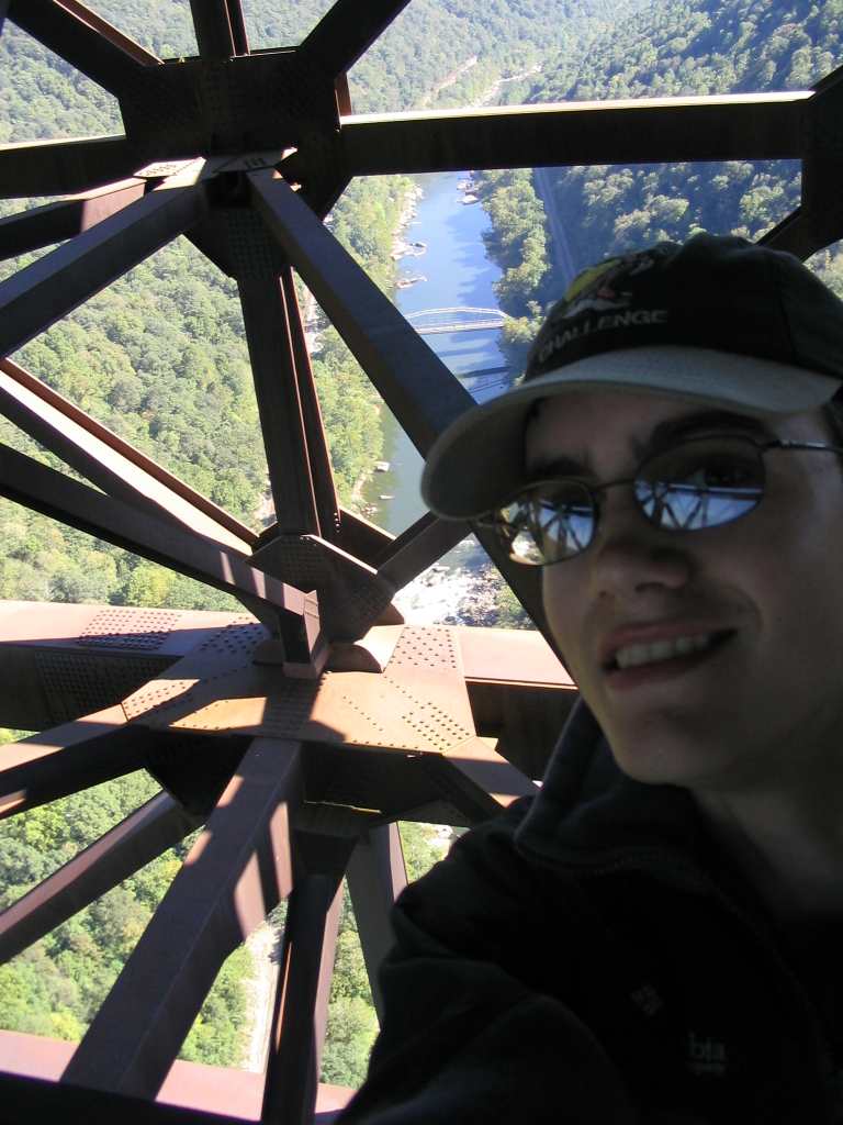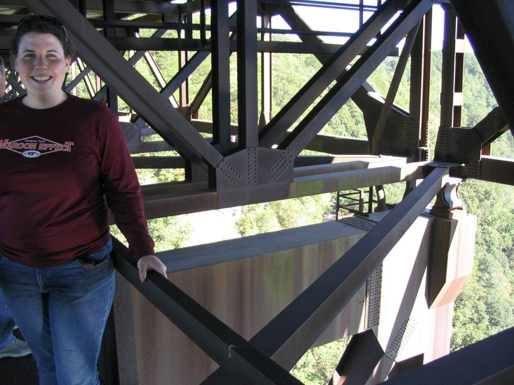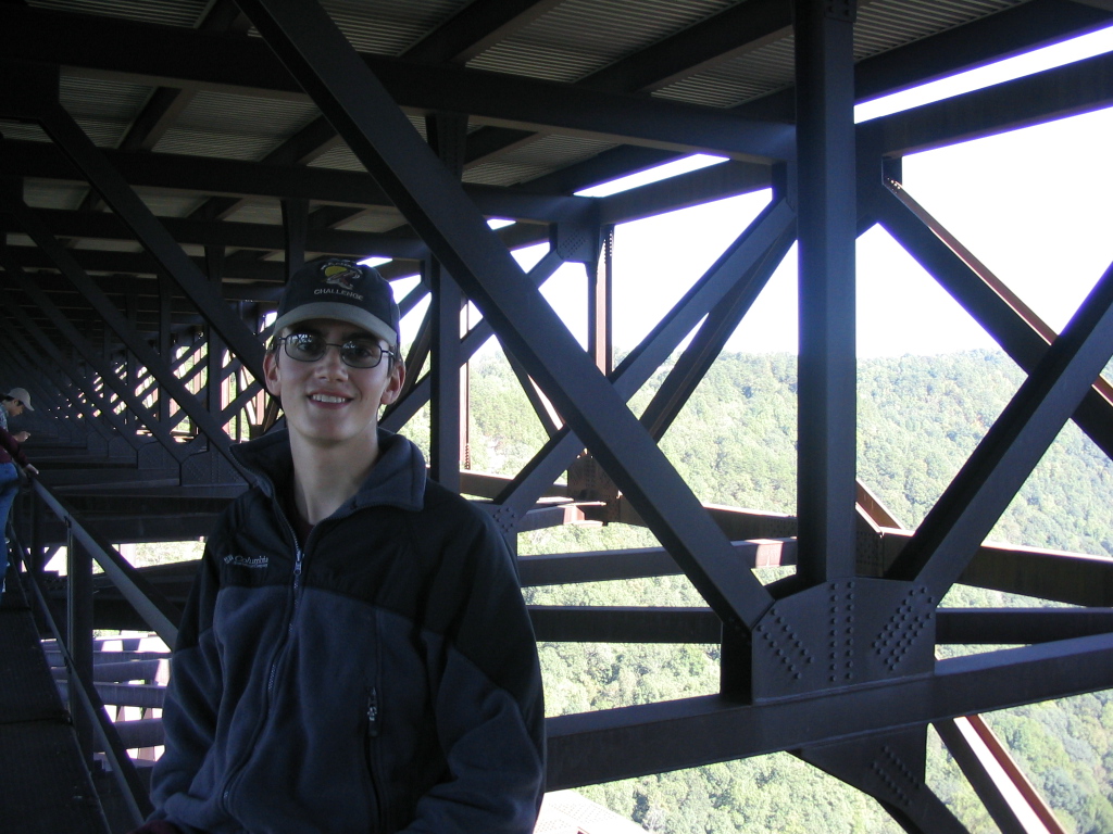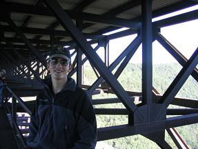 So here we are now, yet another picture of me. I'd like to take this moment to point out what we were walking on: an 18 inch wide steel plate with two handrails and a shin rail. You know, a shin rail. To keep you from slipping out under the handrail. Which would have been really bad.
