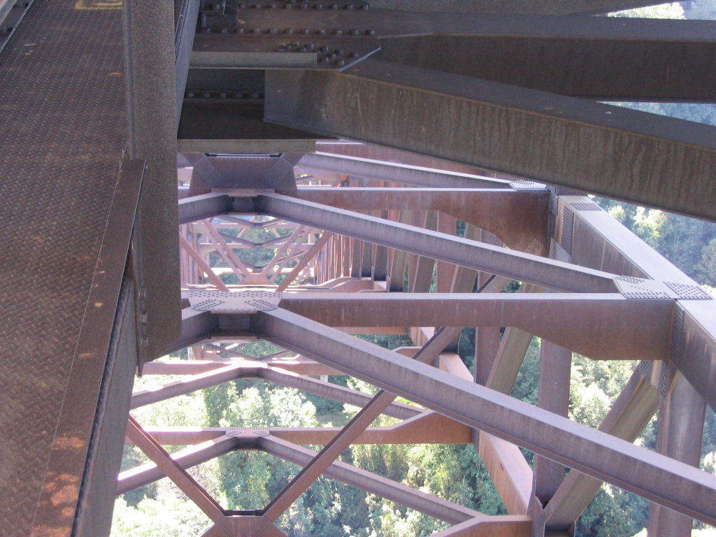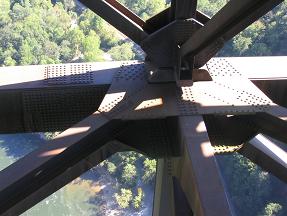 | Look at all of these bolts! The largest joints on the bridge have over 2,700 of them. By virtue of the shear number of bolts, the overall stiffness of the bridge is increased. Because the individual bolt holes have relatively large tolerances, the huge number of bolts reduces the wiggle in the joints. In fact, at the center of the 3,000 foot span, the bridge only shakes about 3 inches when a large truck goes over. Which was disconcerting enough, if you ask me. By the way, this is the center of the bridge (yet again). |