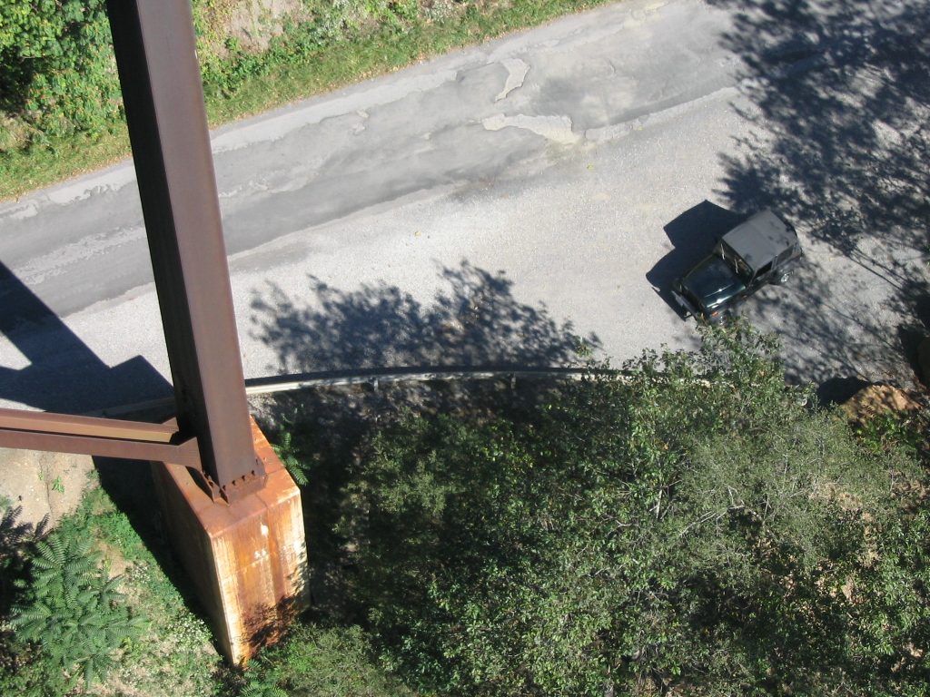 Here's a car parked on route 82 next to one of the bridge's smaller foundations. We are still about 400 feet above in this picture.