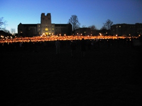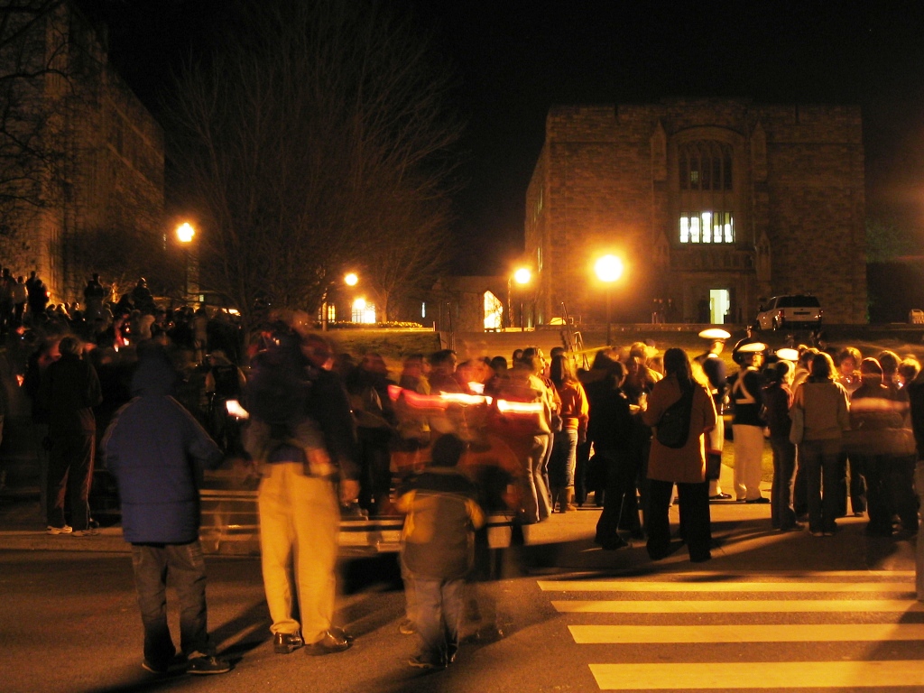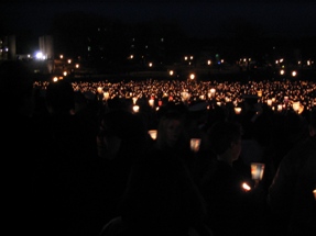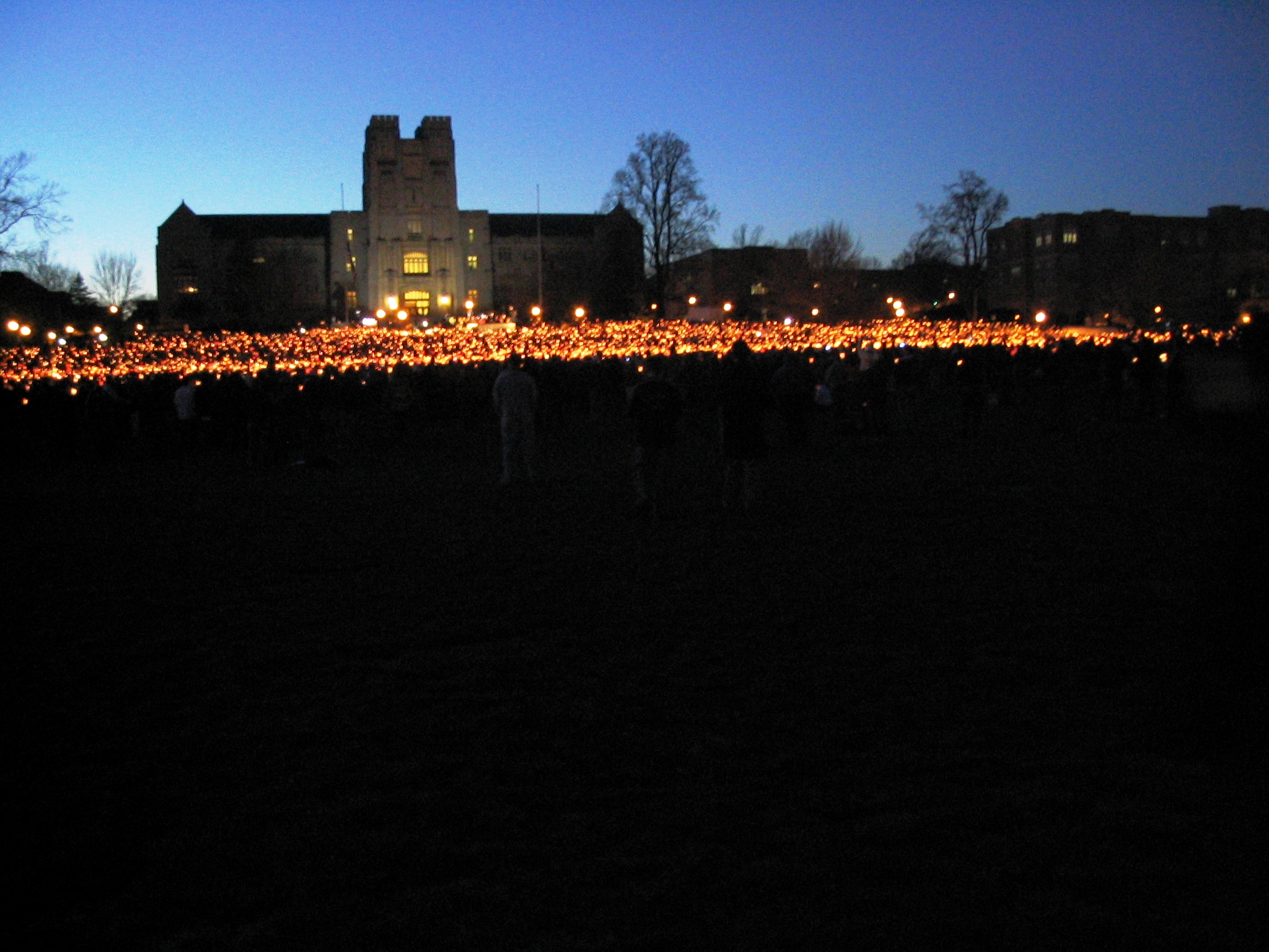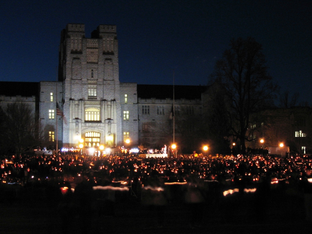 | On the day after the event, the university (Hokies United, specifically) held a candlelight vigil. Many people showed up. This is the crowd in attendance when the event was supposed to be beginning. | ![]() |