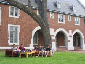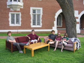 | We decided that the weather was so wonderful outside that we would have the last session of our Colloquium Magnus class outside. I'd always wanted to set up a sofa in the yard, and Tory was totally gung-ho about the whole idea. | ![]() |