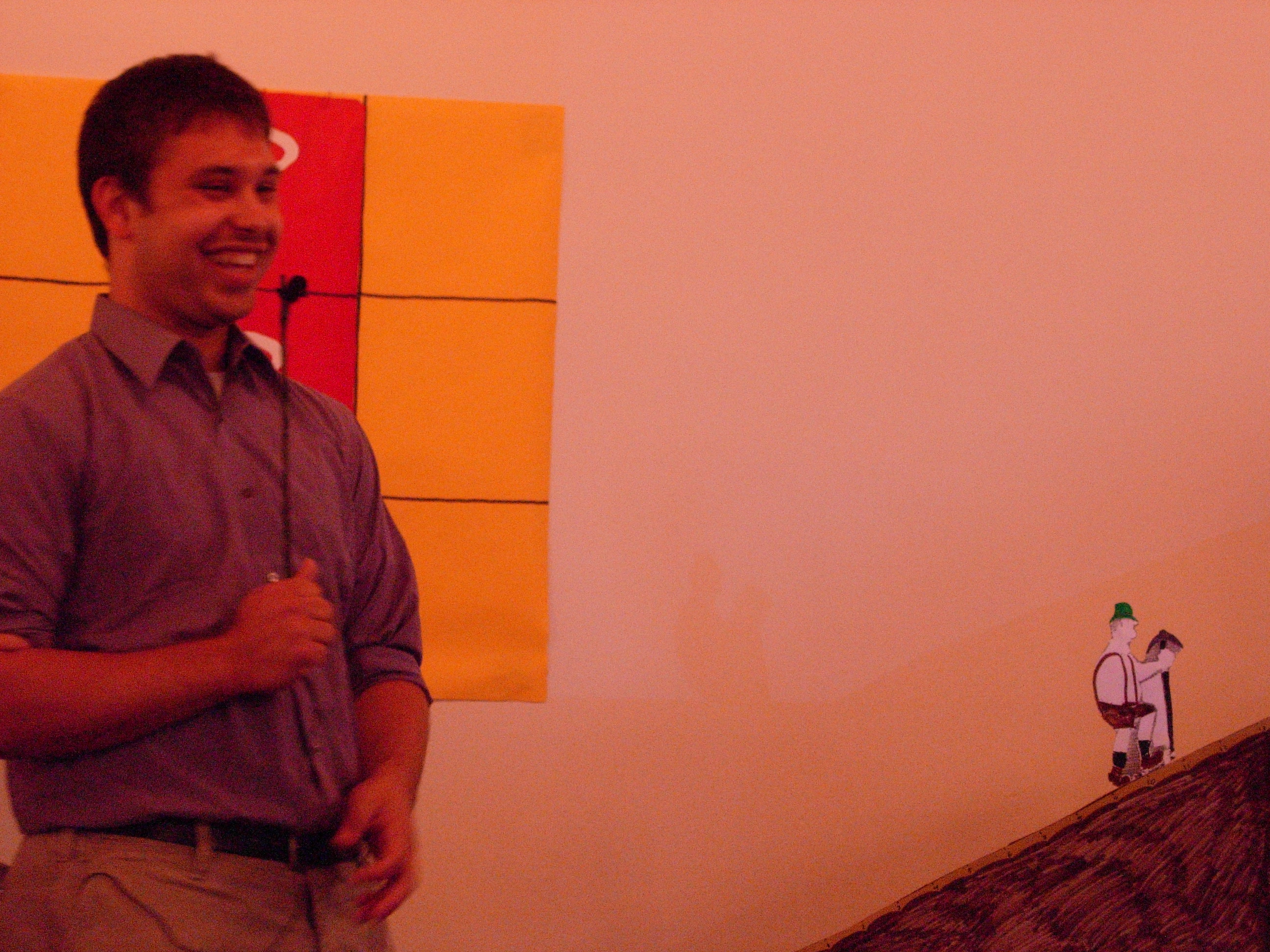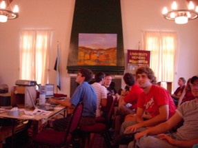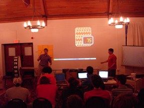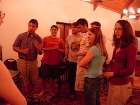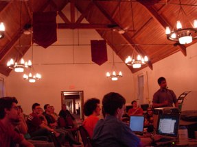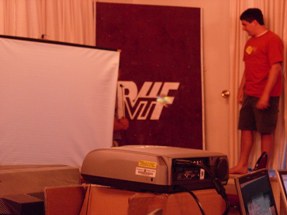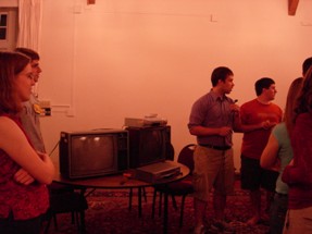 Ooh, our sophisticated A/V system... a computer with Notepad open, and a computer with iTunes open. In all seriousness, the Notepad computer was running several HTML files (websites) that refreshed every second automatically (for instant updates) and a powerpoint presentation, but still. | |