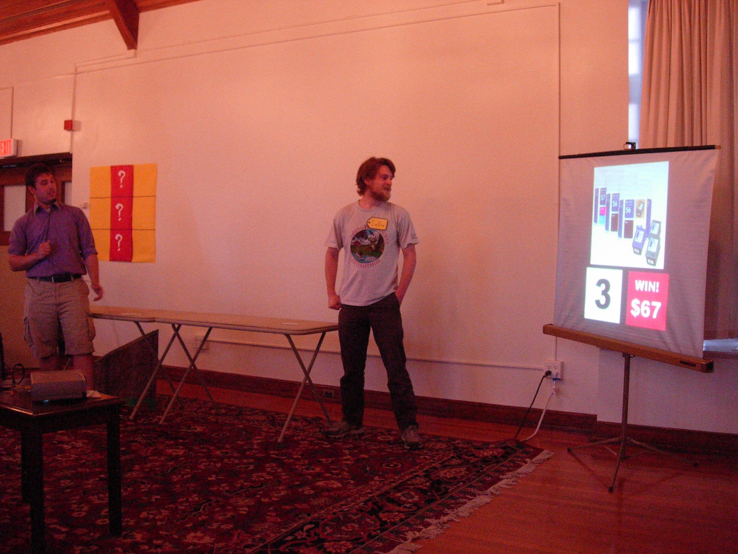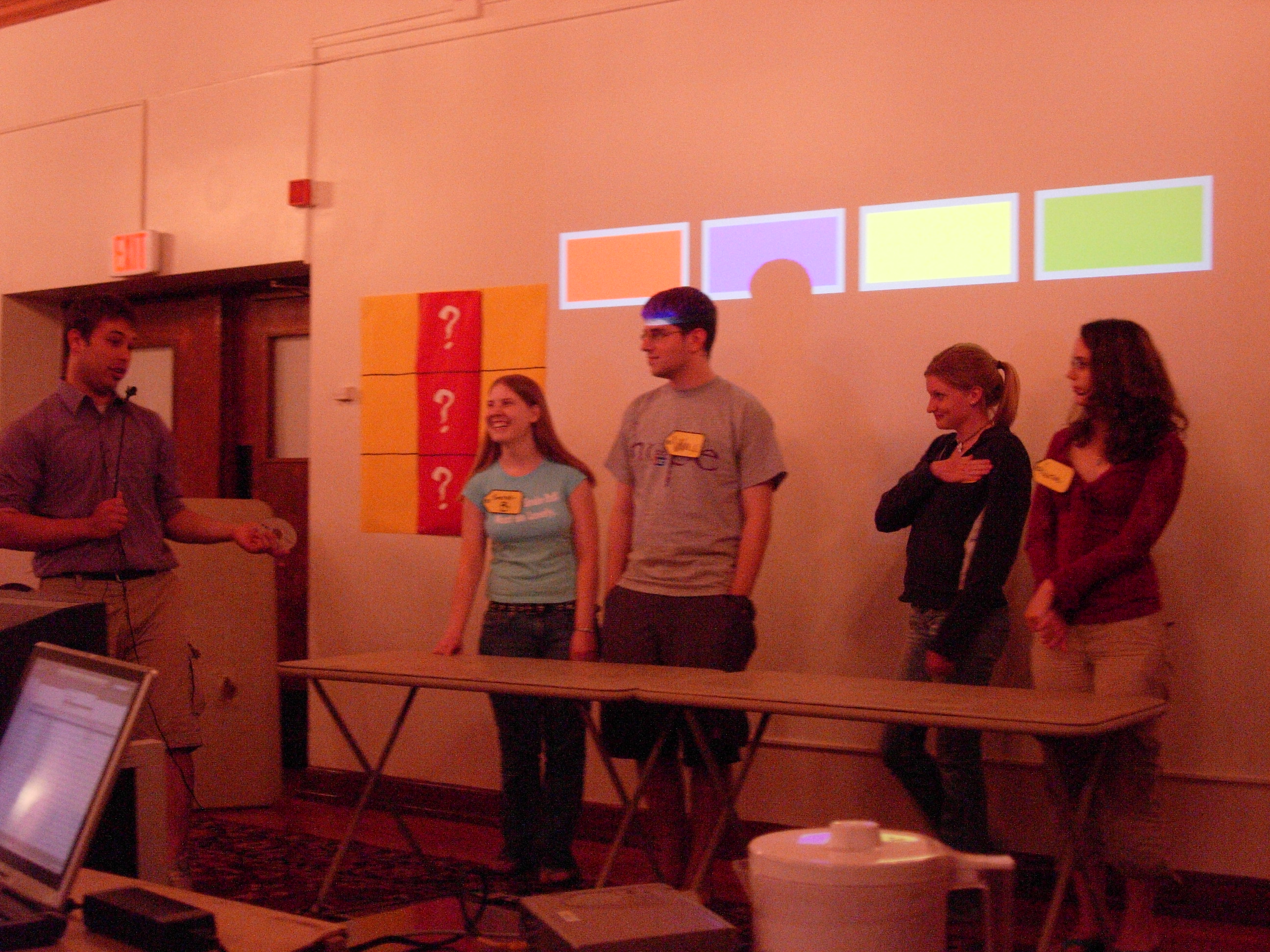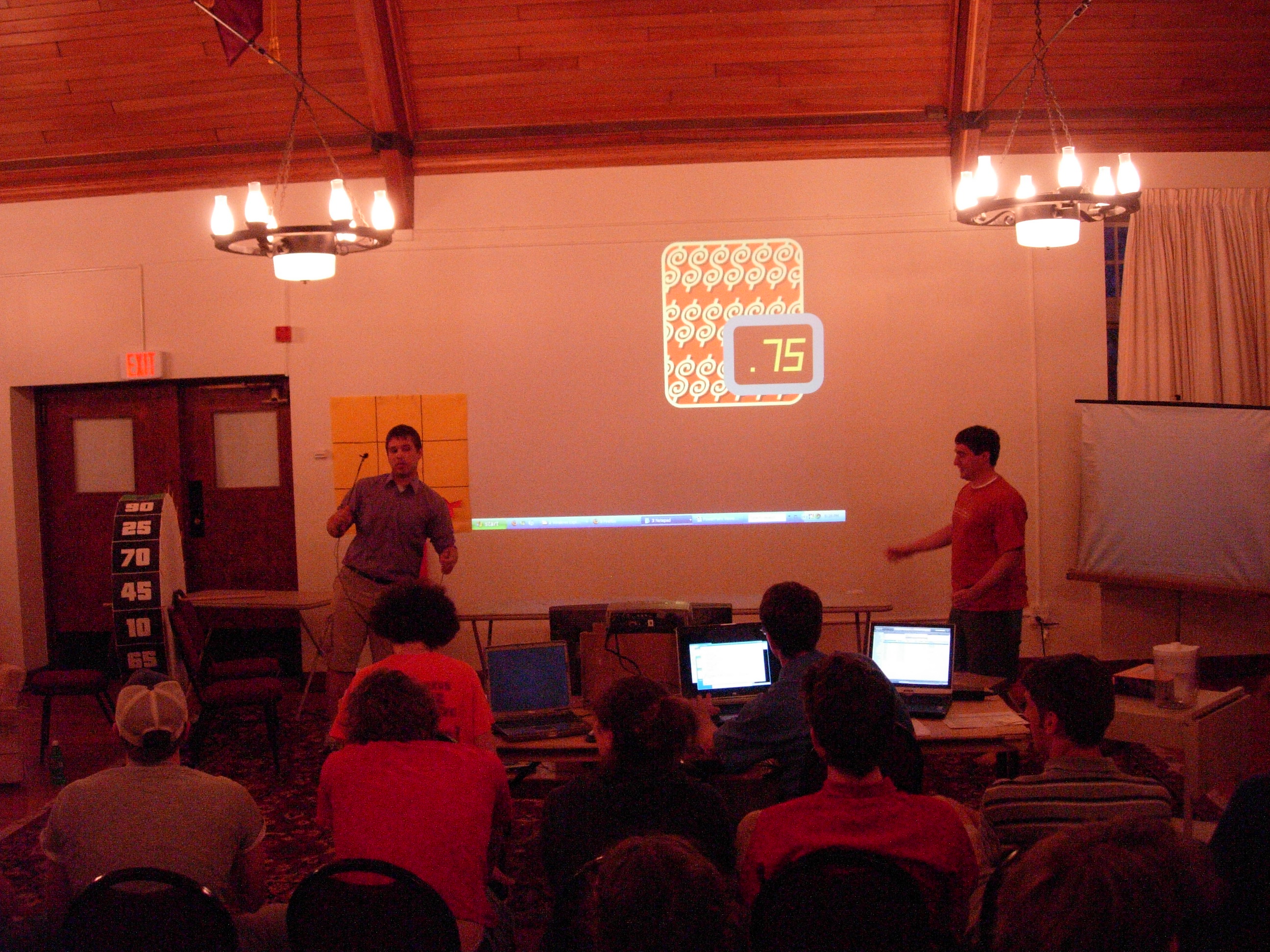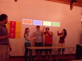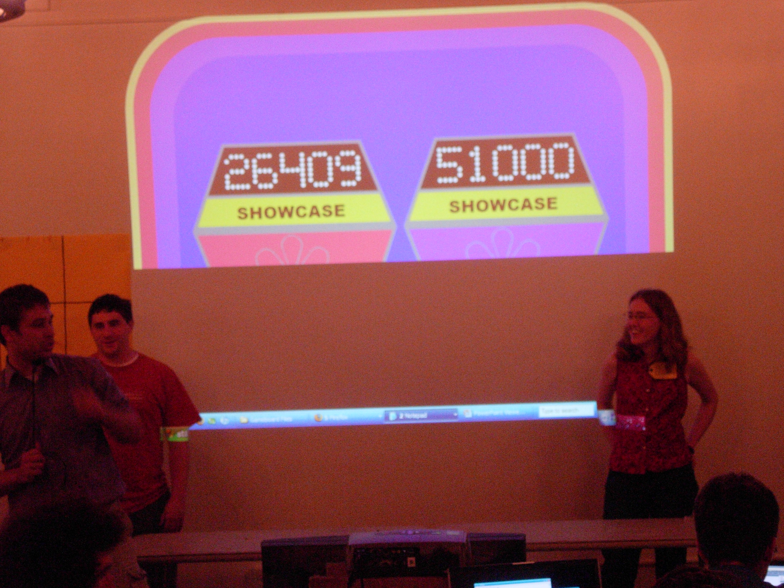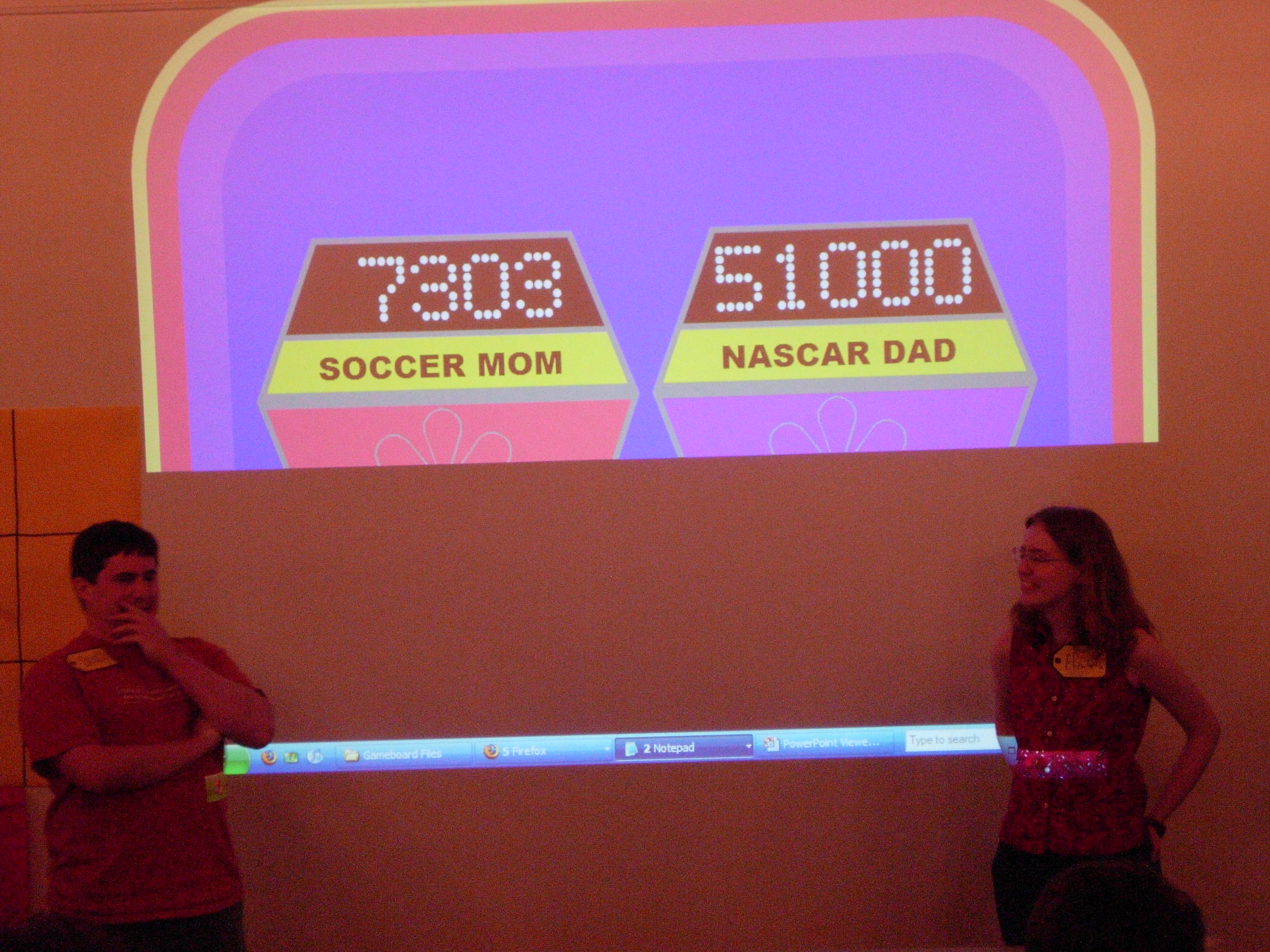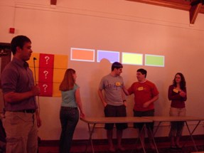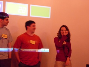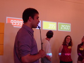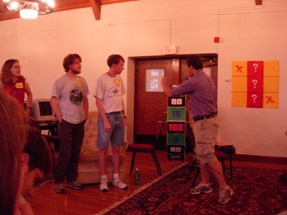 We had to do some on-the-fly modifications of the game software to fit the technology available, but we got the thing running. Rod "Jeremy" Roddy called our first four contestants on down, I forgot to advance the slideshow (temporarily blinding Collin and company), and things moved on. Like the background? It's the actual font: pricedown. | |