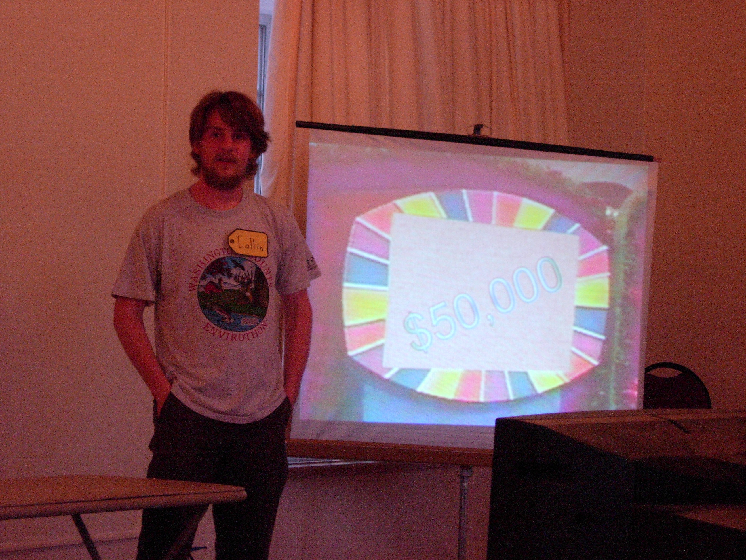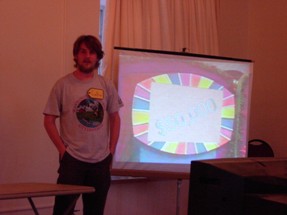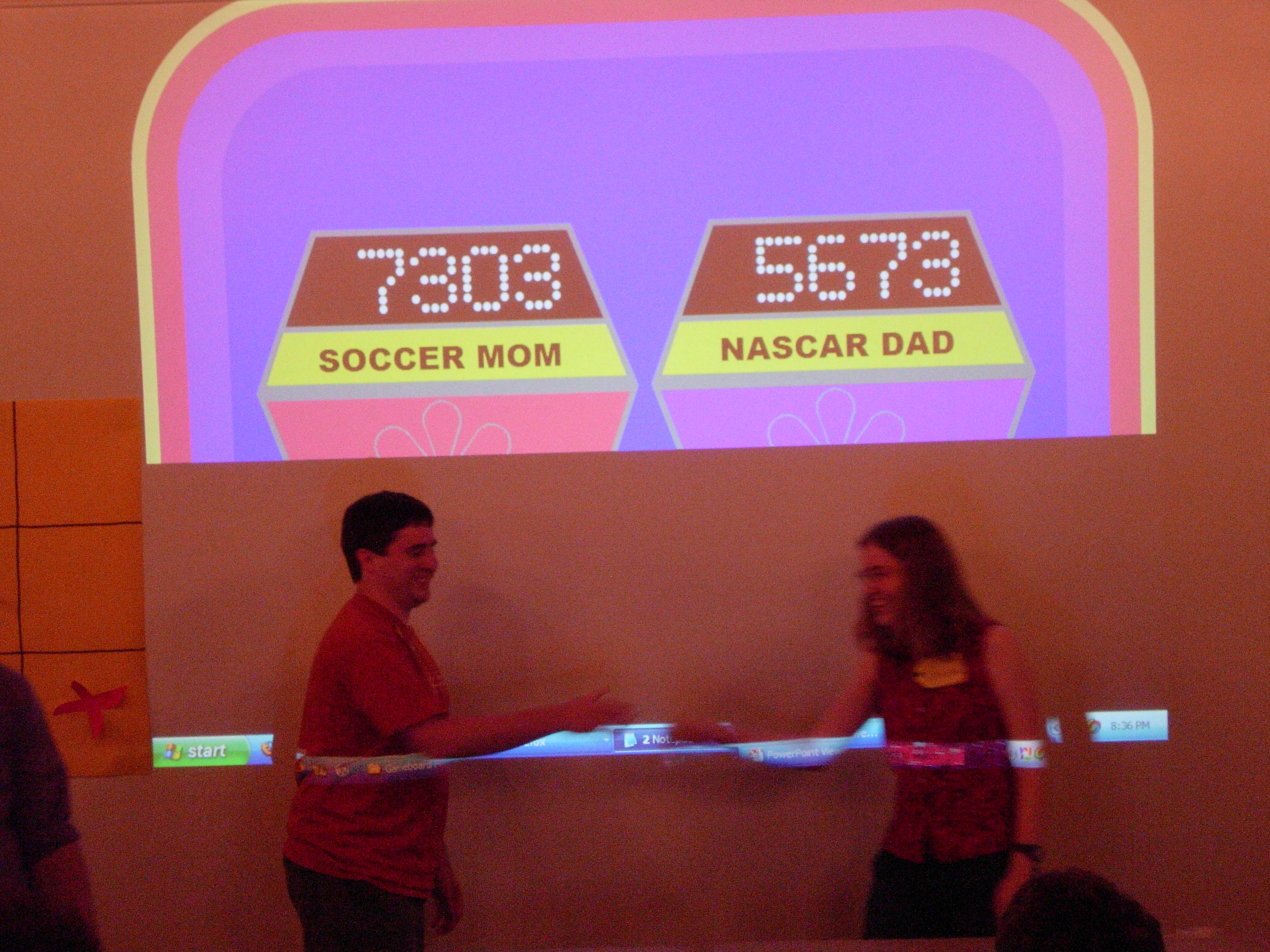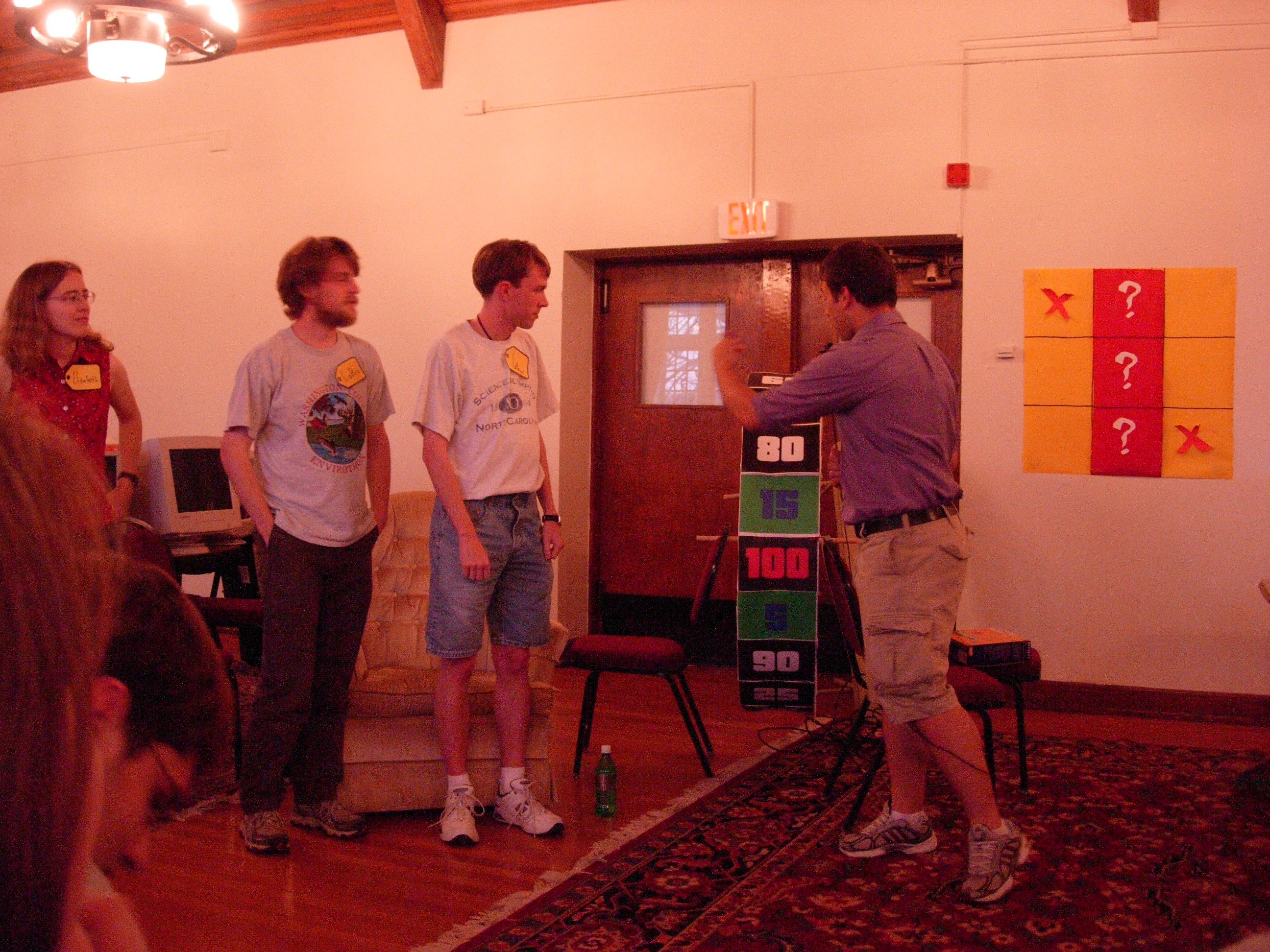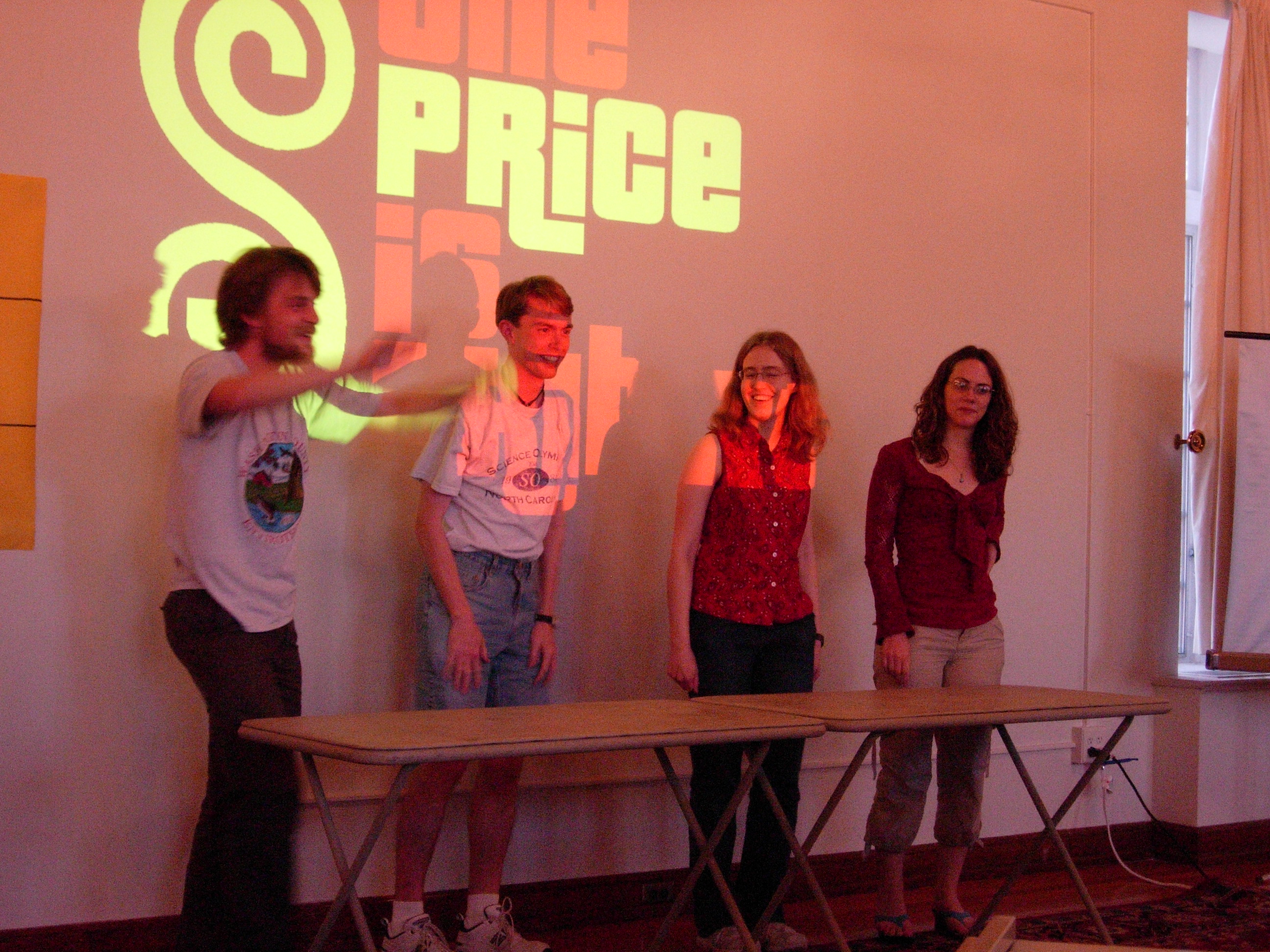 We had to do some on-the-fly modifications of the game software to fit the technology available, but we got the thing running. Rod "Jeremy" Roddy called our first four contestants on down, I forgot to advance the slideshow (temporarily blinding Collin and company), and things moved on. Like the background? It's the actual font: pricedown. | |