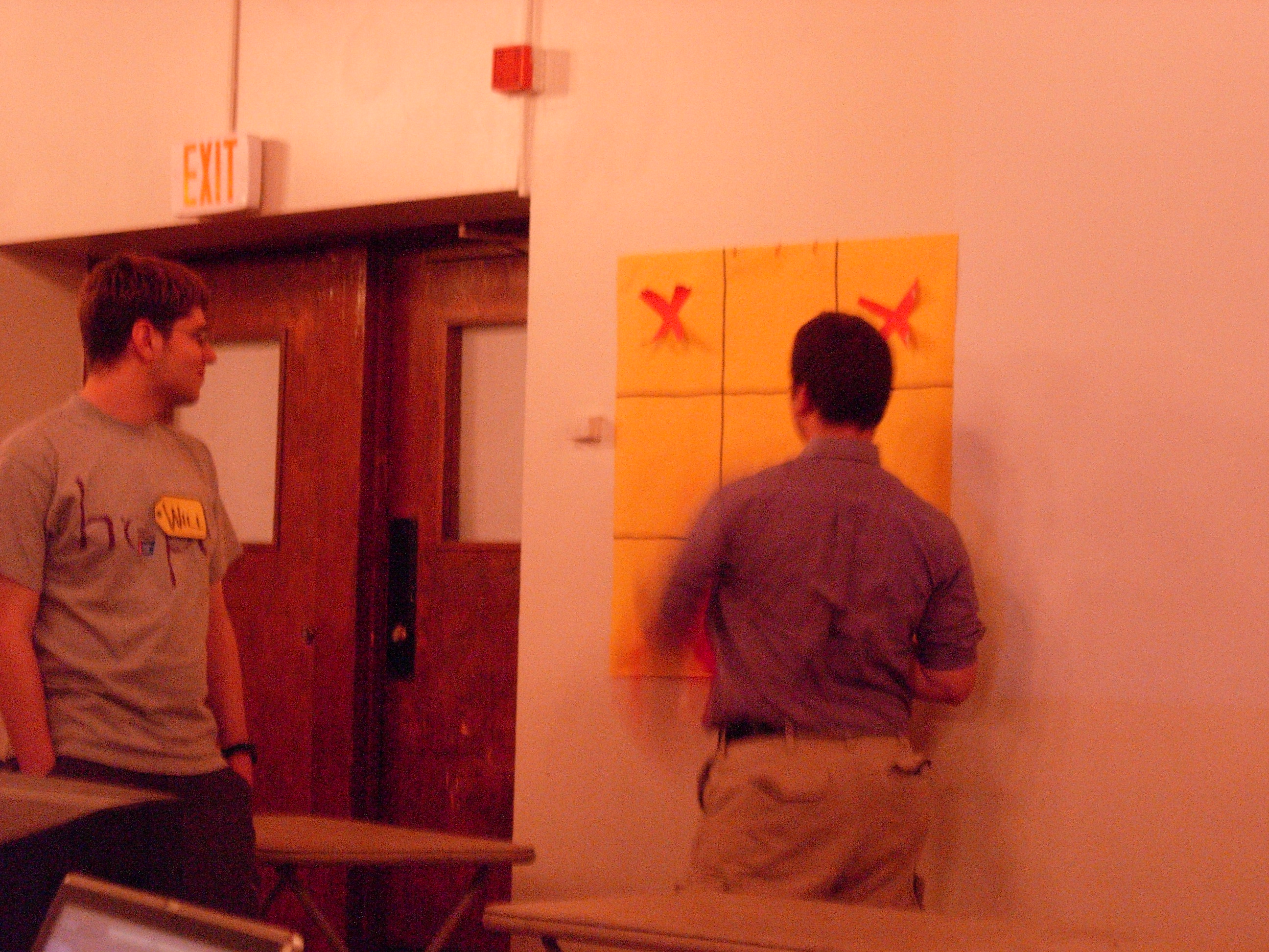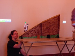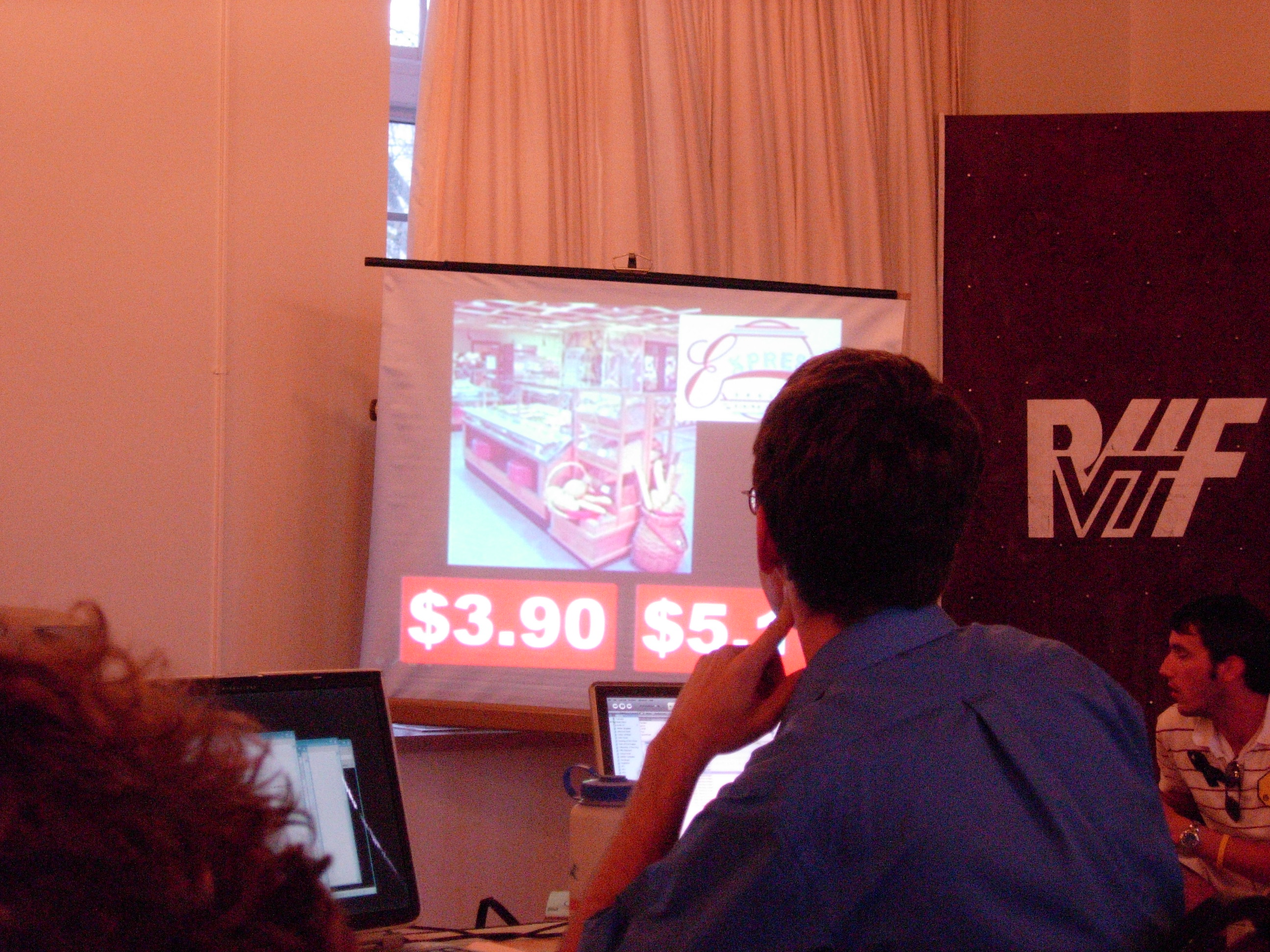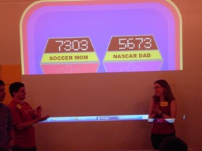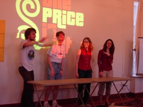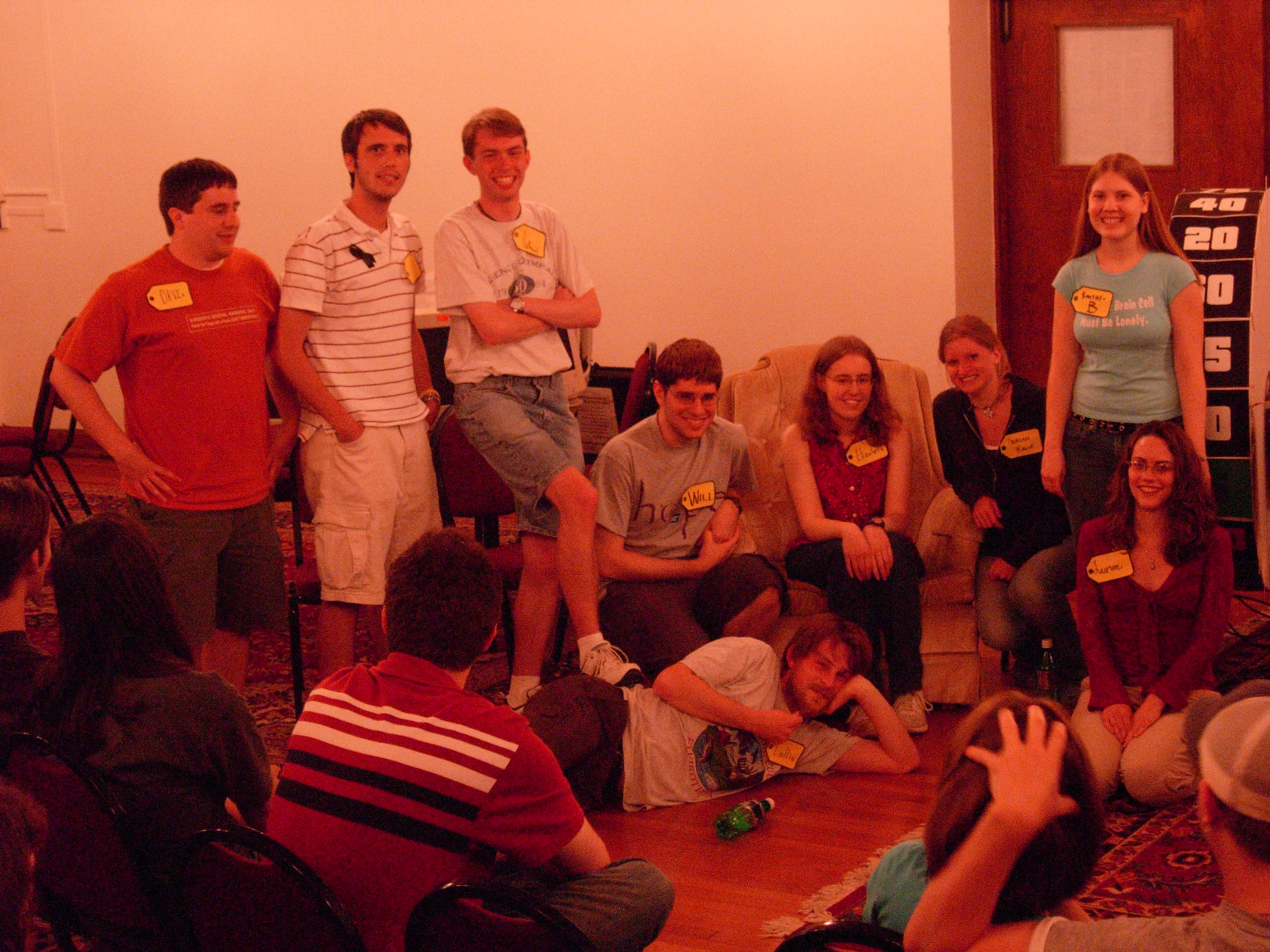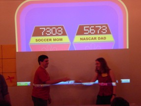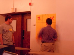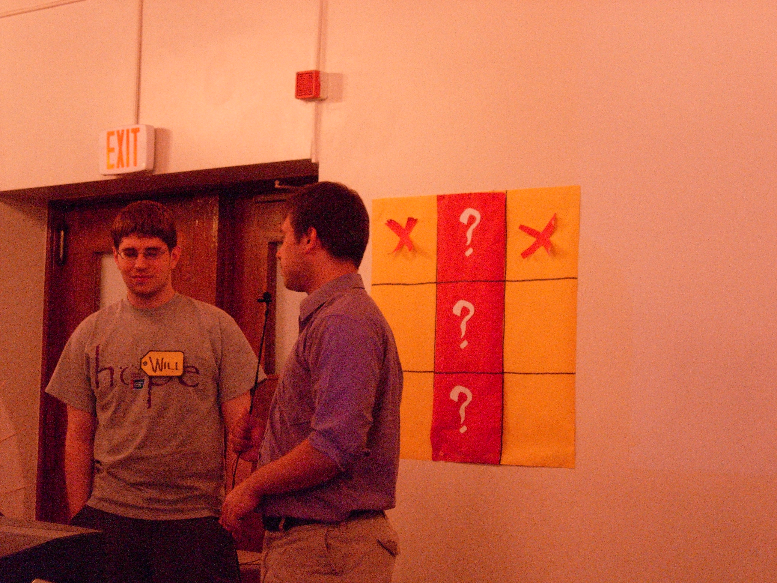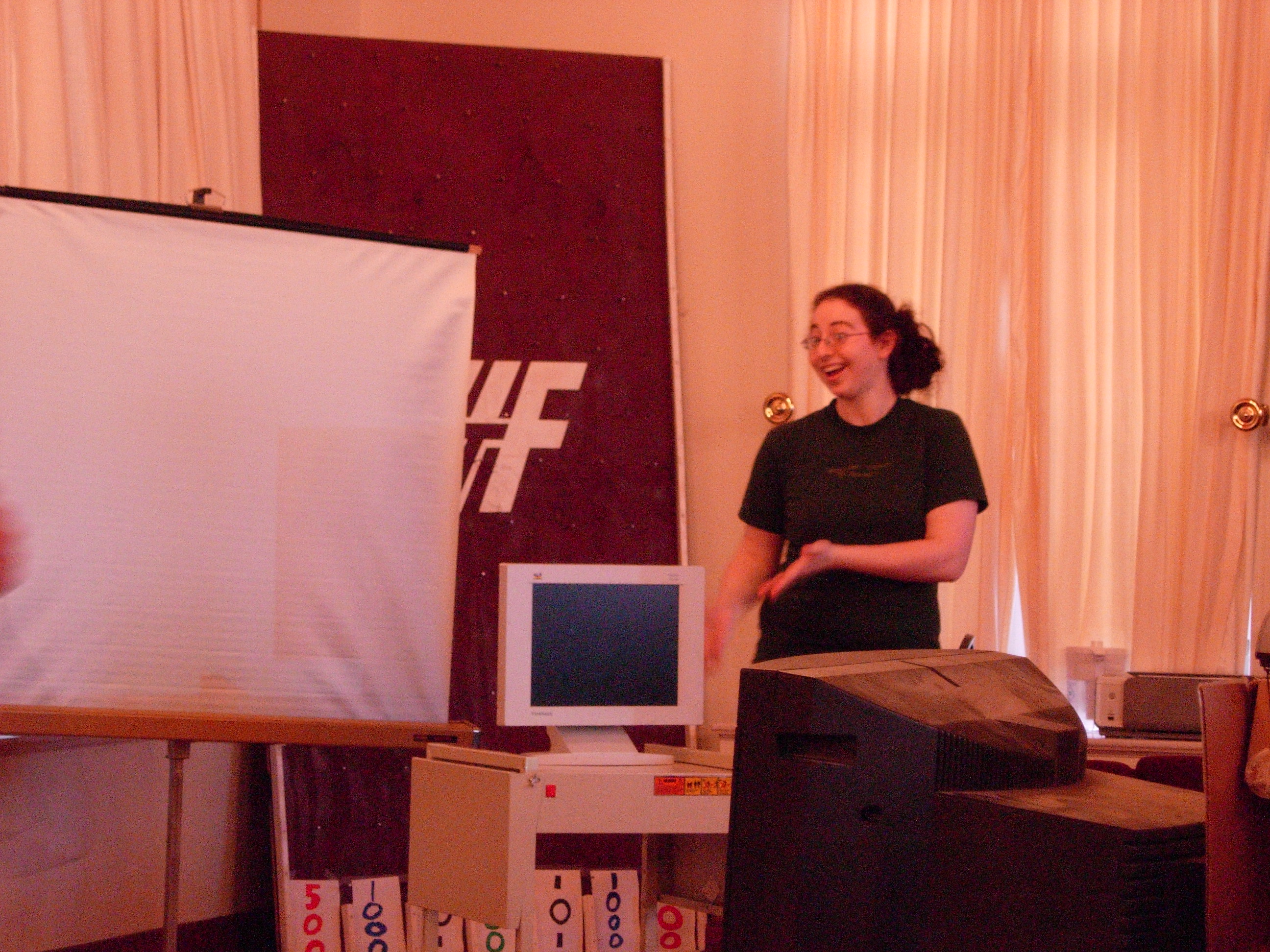 We had to do some on-the-fly modifications of the game software to fit the technology available, but we got the thing running. Rod "Jeremy" Roddy called our first four contestants on down, I forgot to advance the slideshow (temporarily blinding Collin and company), and things moved on. Like the background? It's the actual font: pricedown. | |