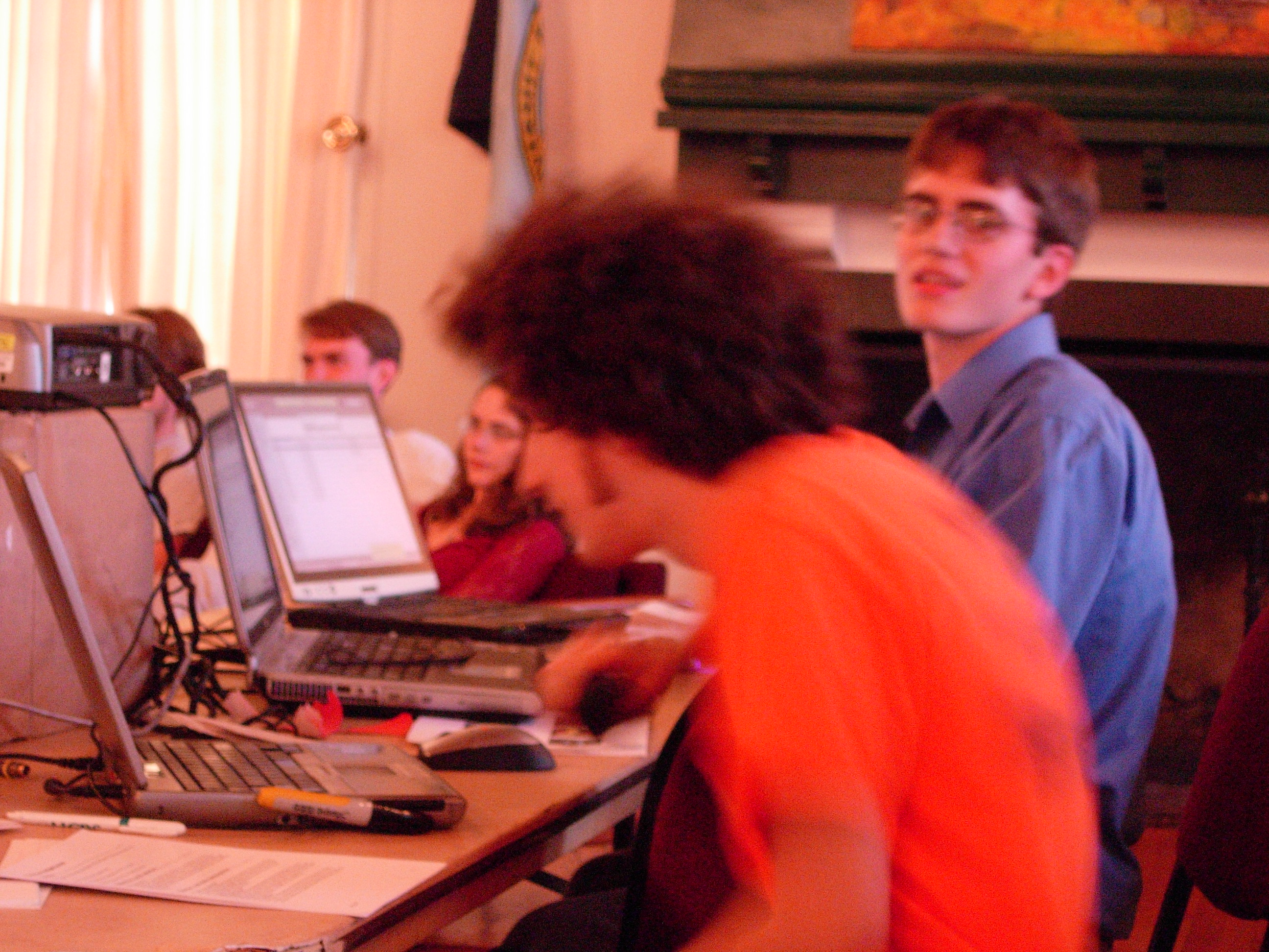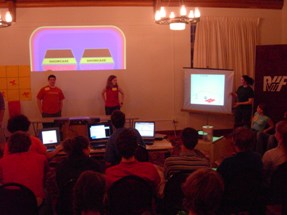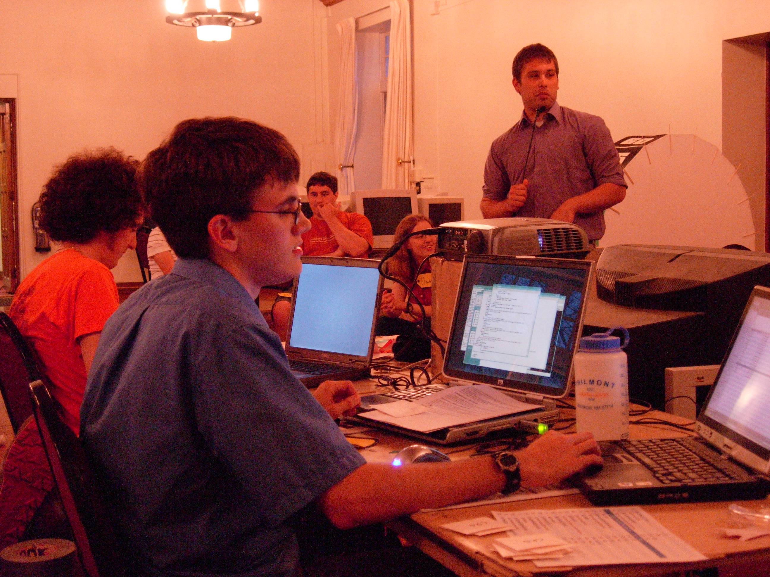 The judging crew working hard to keep the stuff going. Three computers, a TV, two projectors, a jumbo speaker, and a rats nest of cables equal total awesomeness. | |
