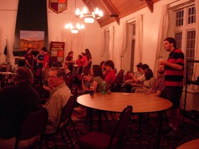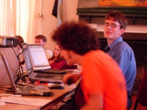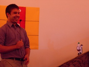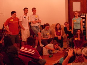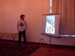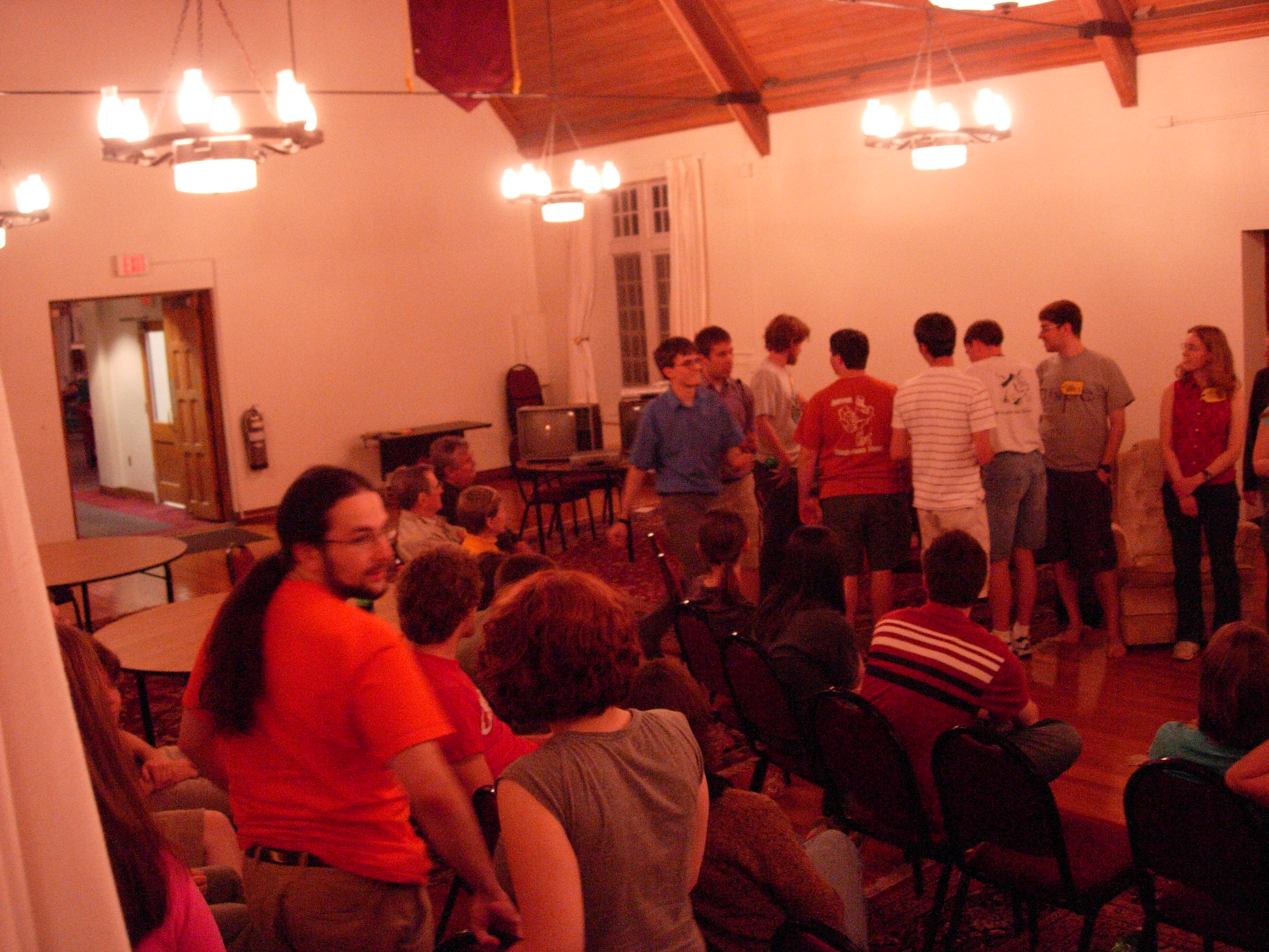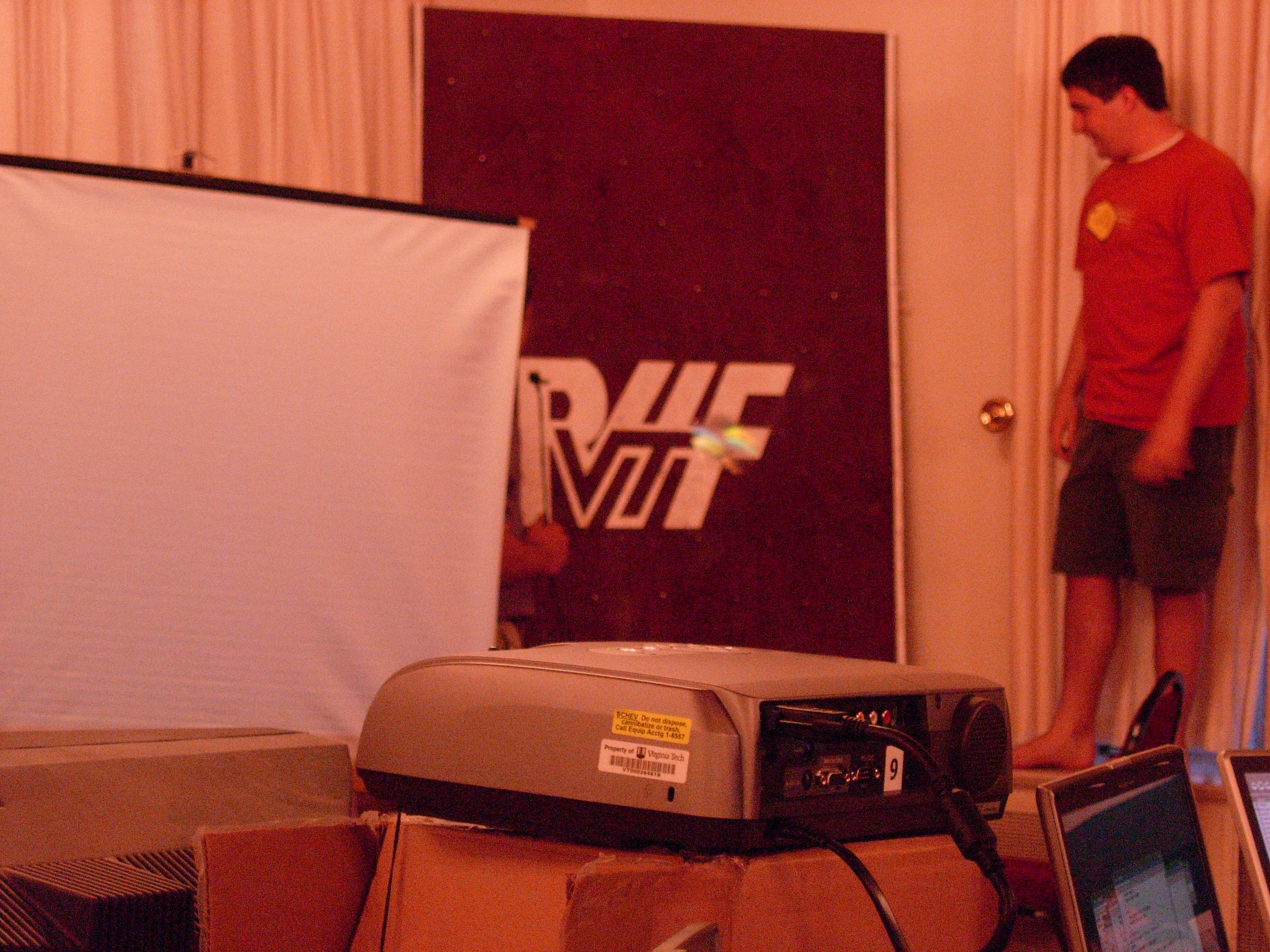 Following the events earlier in April, the conclusion of NerdFest had to be shifted around. But we still pulled the thing together. I mean, Jeremy's room was crammed full of prizes for the thing, and we wanted to be able to give them away without just junking them. So, a week after the scheduled date, we put the thing on ourselves, since Main Campbell was dealing with their own issues. The turnout was better than expected, and in true NerdFest Closing Ceremony tradition, we were running late. But the crowd was understanding. Here, Roger "Peter" Dobkowitz finished off the programming. And now for one of many video clips, this one on the room setup. |