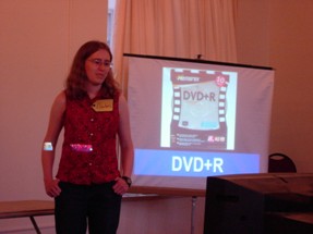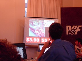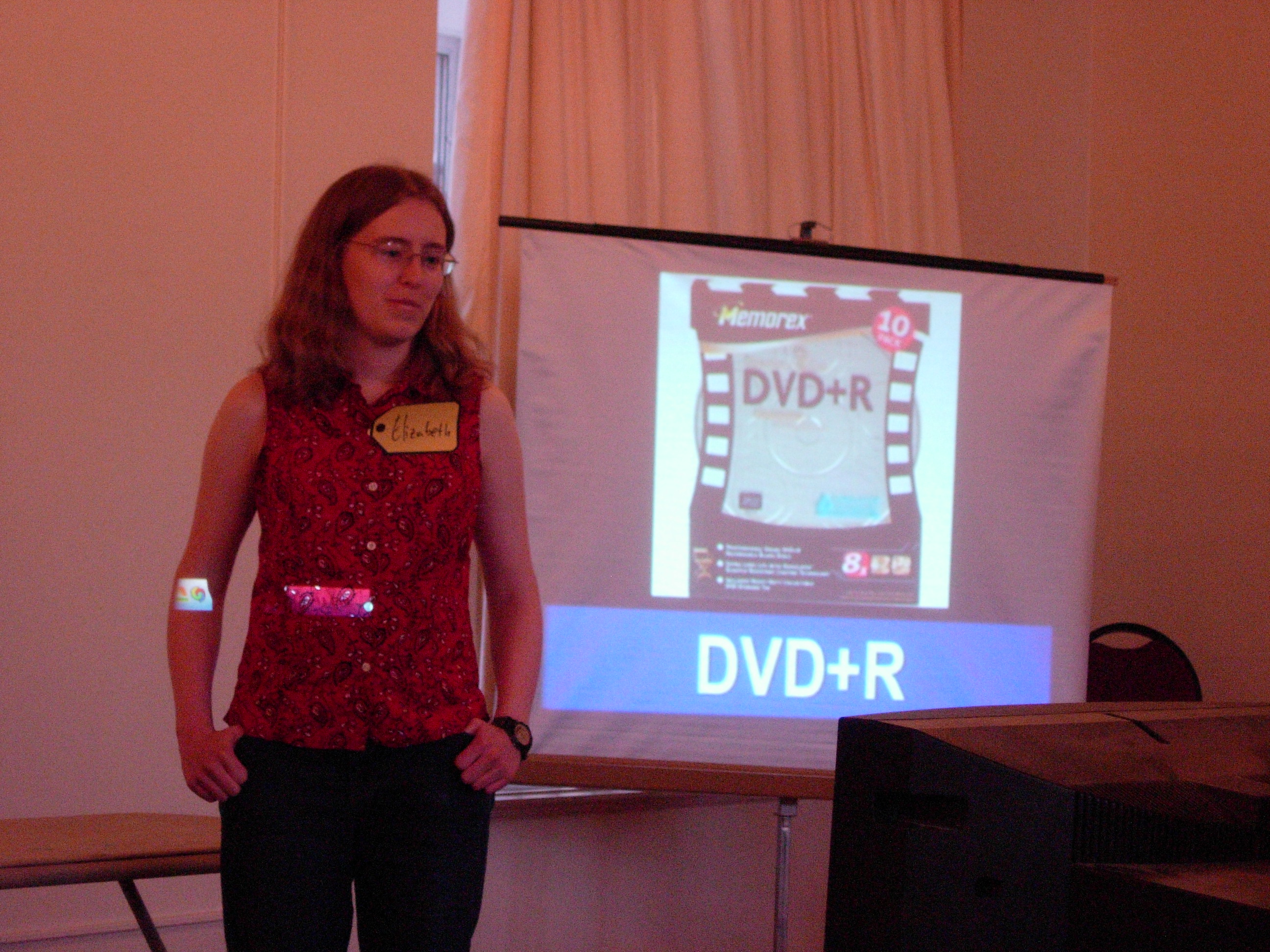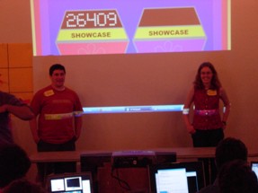 | Our first showcase winner: Elizableth, formerly of HC, but studying abroad in MC. She gets to play Cliff Hangers! Here, she bids on a set of DVD+Rs. There's a TV in front of her showing the same image, so she can look towards the audience while bidding. Cool, right? Yeah, that's what I thought. | ![]() |