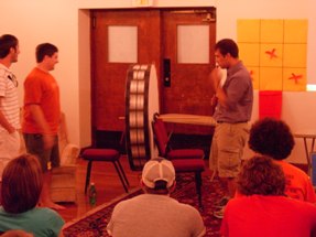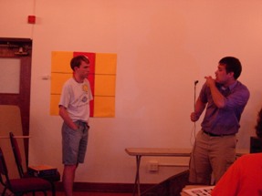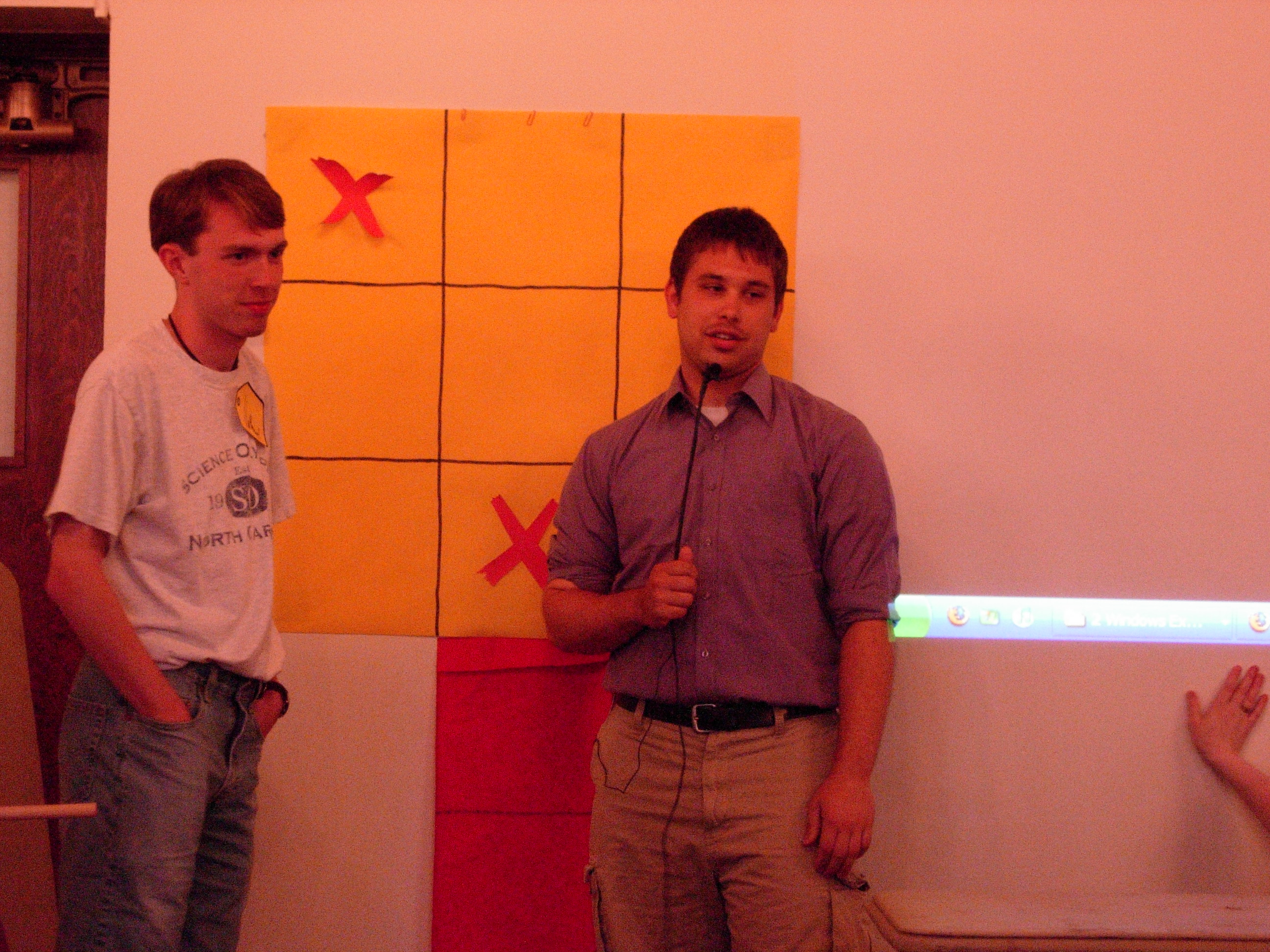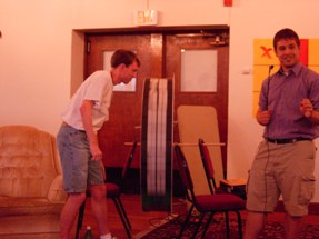| Nate, you get to play Secret "X"! Greg explains the convoluted rules to everybody. Notice his authentic-looking microphone thing! | ![]() |