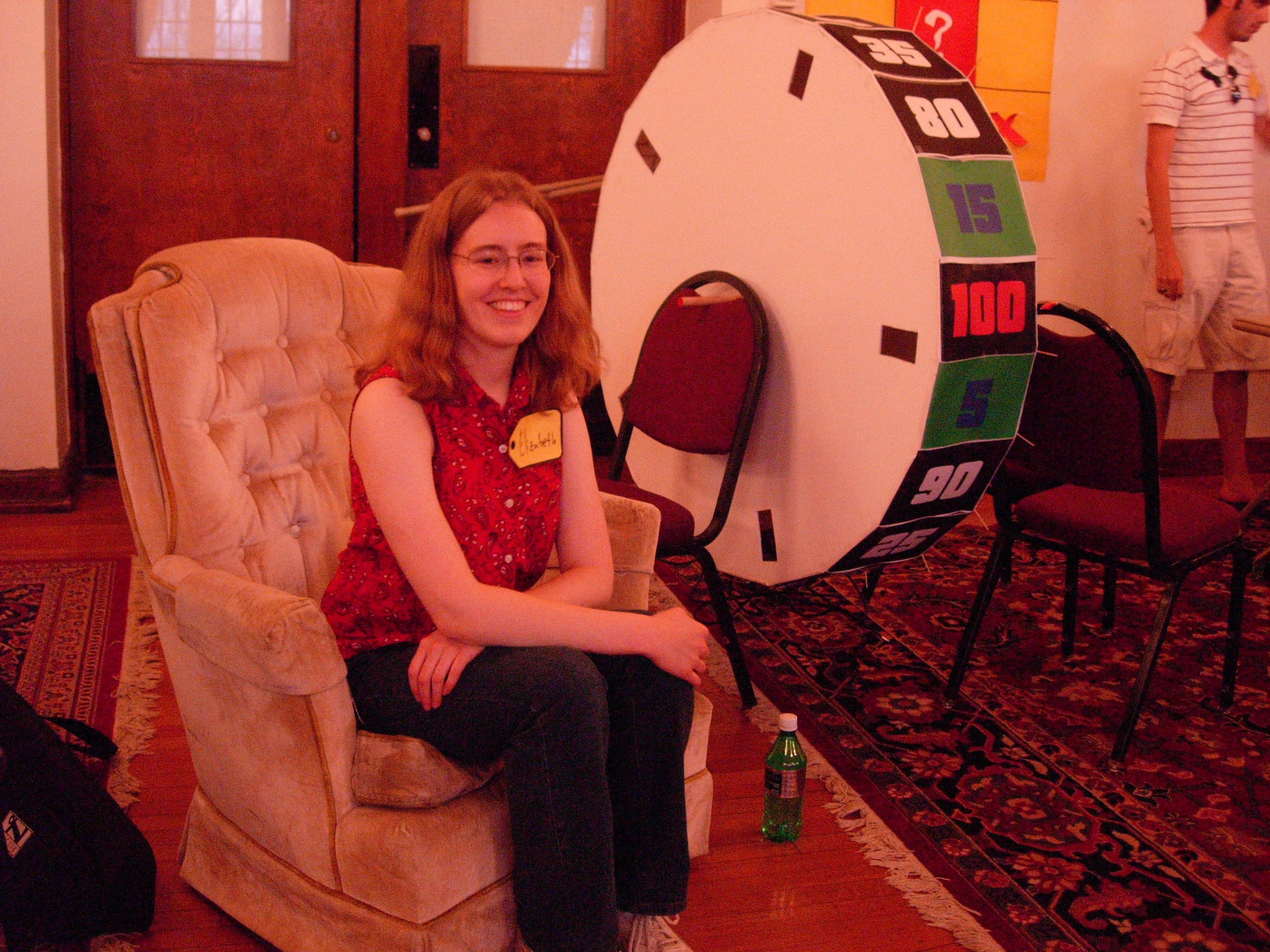 But now it's time to spin The Large Wheel! Our wheel is smaller than The Big Wheel, but was probably a crapload cheaper. A $17 4'x8' sheet of foam core and a 1/2" diameter wooden dowell from Mish Mish, 10 soda cans to give the thing thickness, liberal hot glue, half of one of my black ink tanks, and several yards of scotch tape. Put that together with some dining room chairs and a pointer arrow made from folded paper, and you've got yourself a functional wheel. | |
