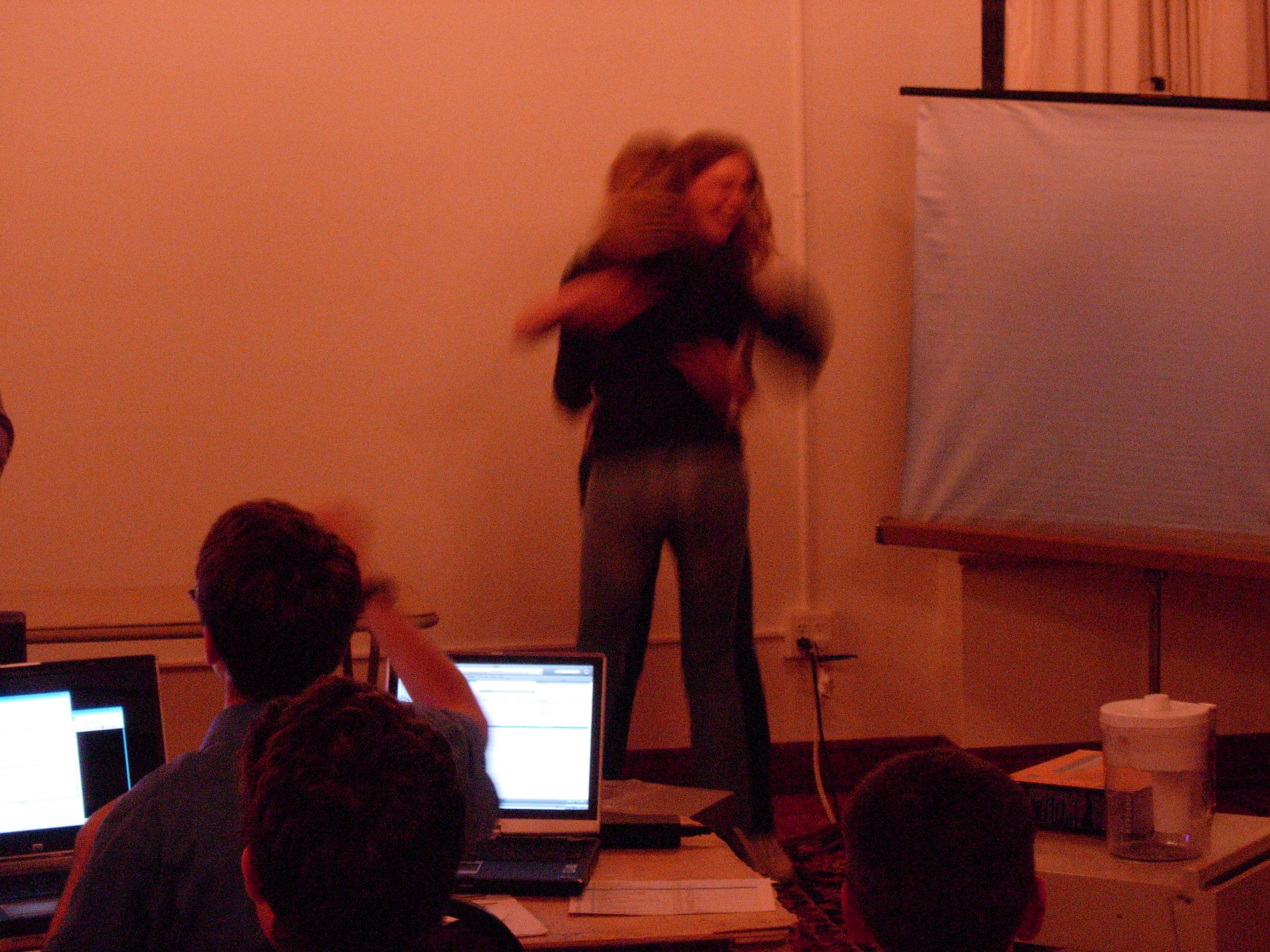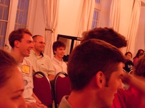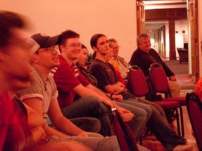 | Yay, artsy audience shot. Brad and Russell talk in the back row, no doubt coming up with some harebrained scheme to take over the world. | ![]() |
