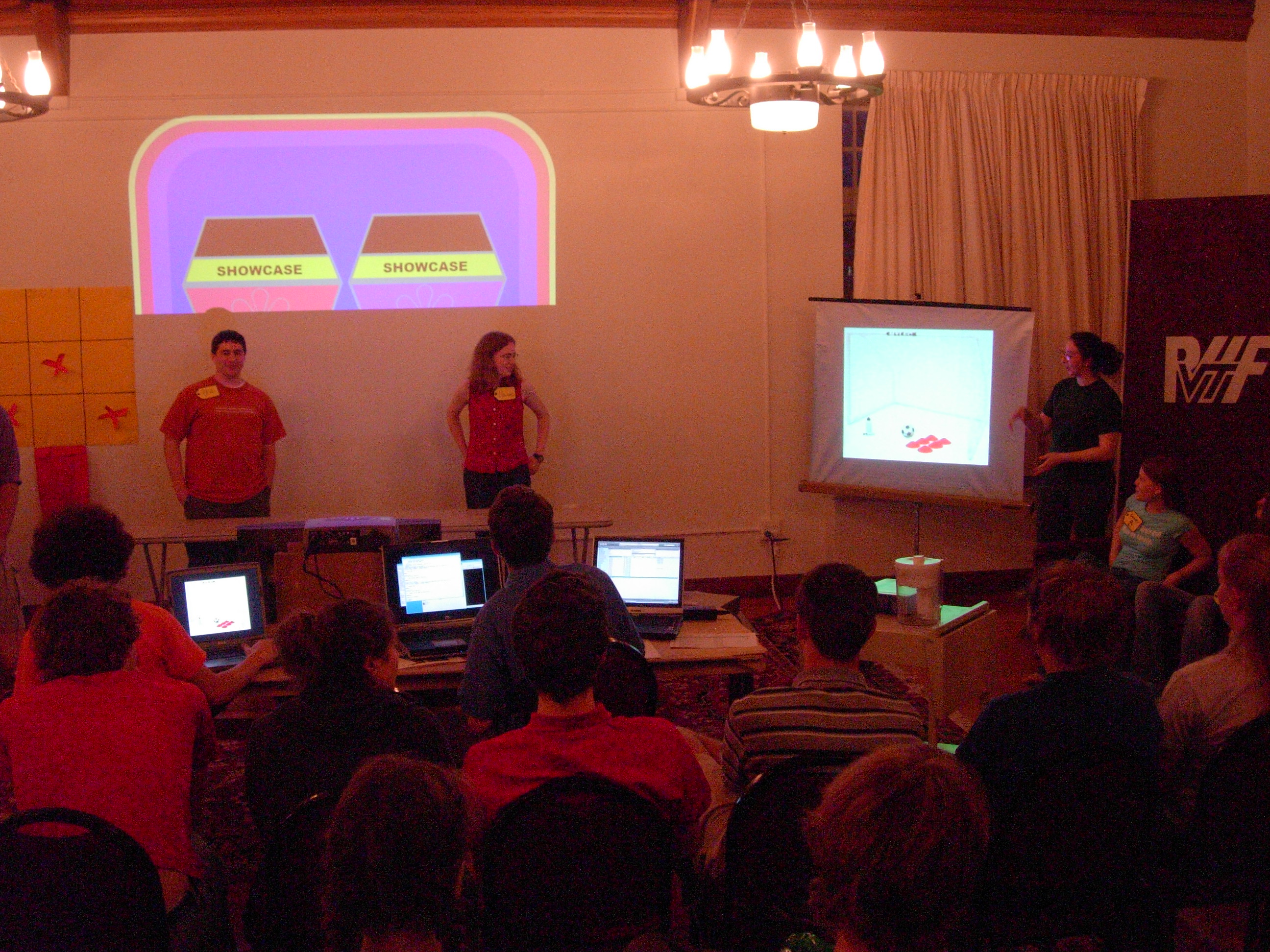 The audience waits while the RHF's plinko board is put into position. | |