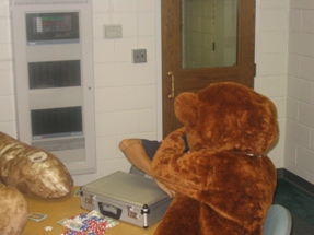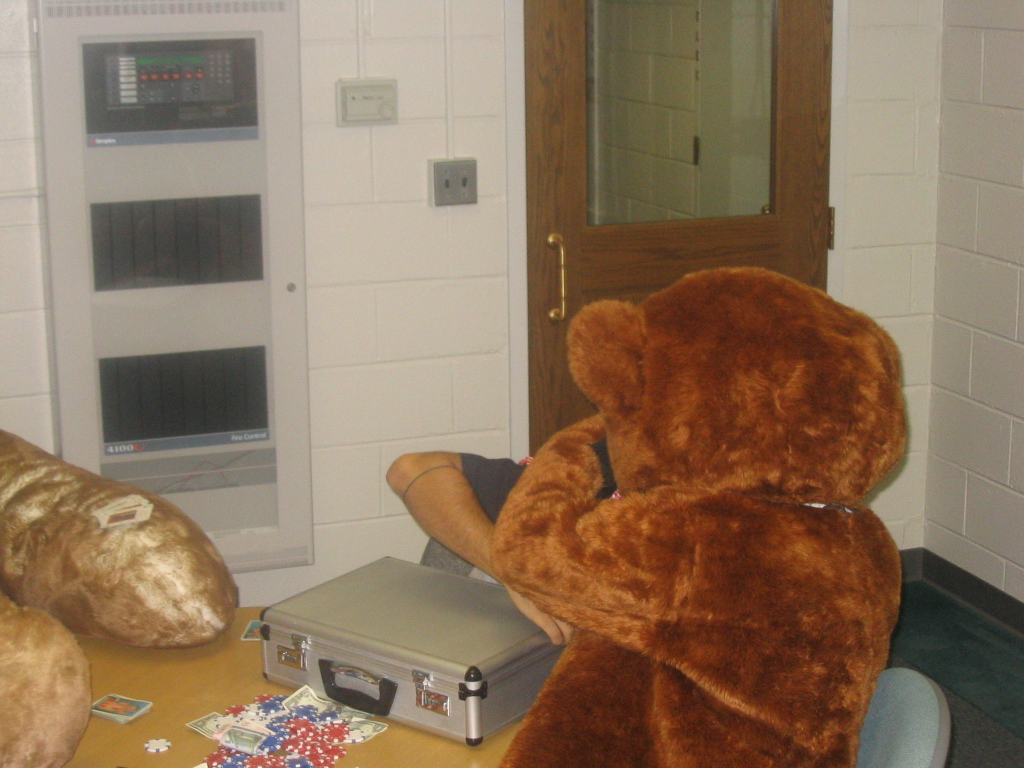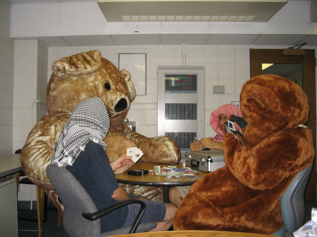 This one day I got back from class and was told something awesome was going on downstairs. So I investigated, and this was what I found: Bears and Terrorists Playing Poker. From left: Alejandro Bear, Col. Luck (a spy in the terrorist network), an unidentified Al-Qaeda member, and Bear E. Cool. |