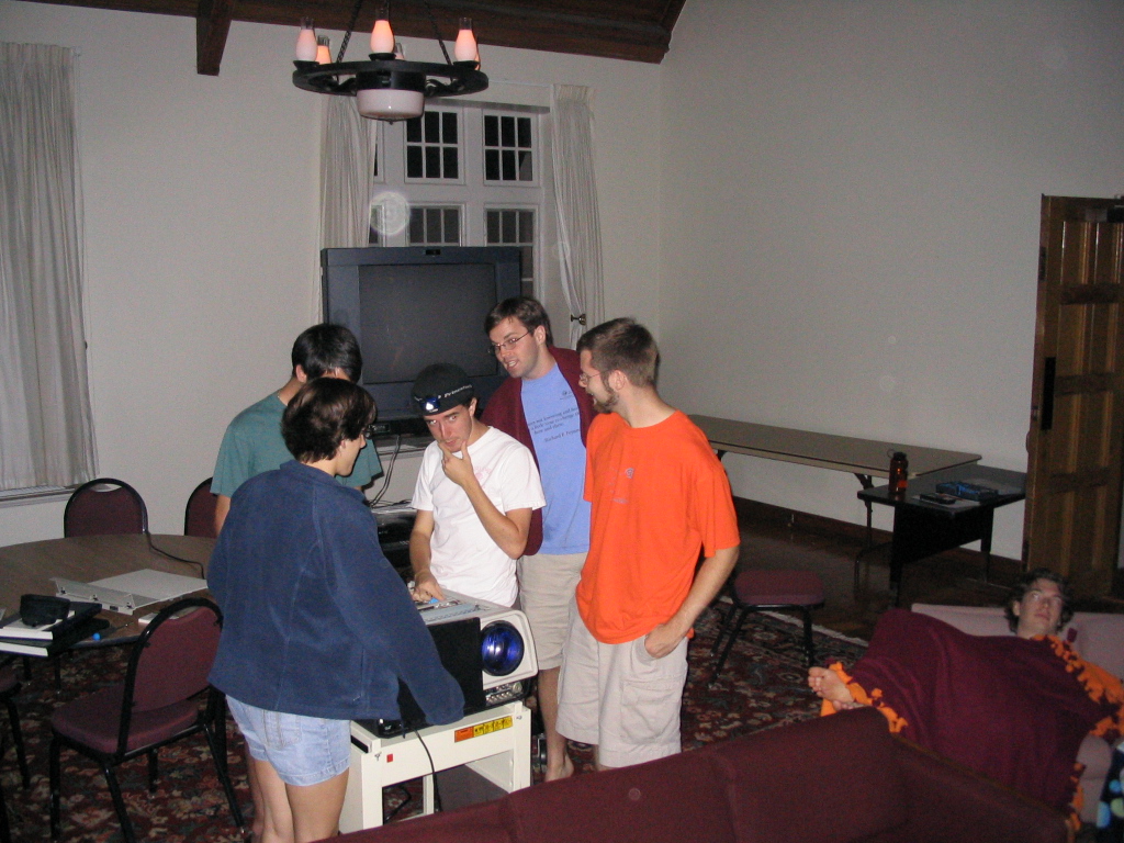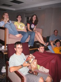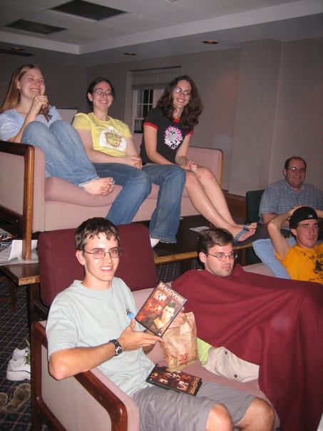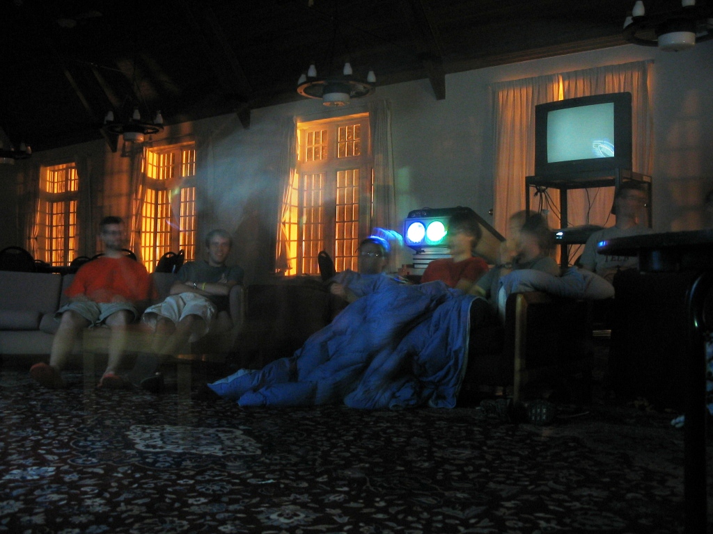 Not having access to a projector seldom stops us from having a good time. Here, we use stadium seating in the Conference Room to watch MacGyver. Picture courtesy of Caitlin. |
