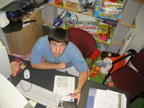 | It's too bad the duty aides are missing out on all of the movie action during the week. Like David Chocolate (name changed to protect his identity), here doing productive things in the RA office. | ![]() |