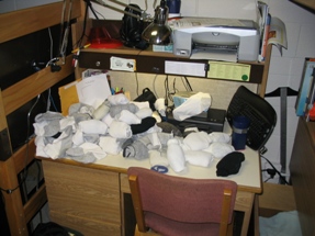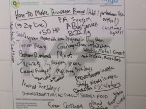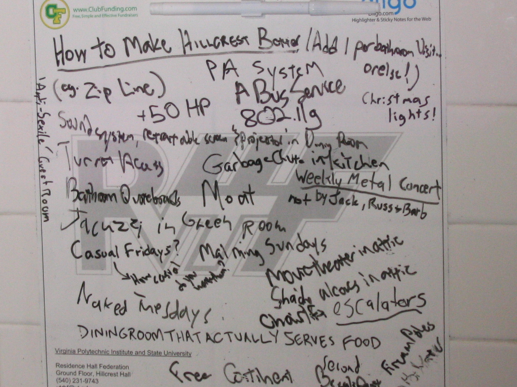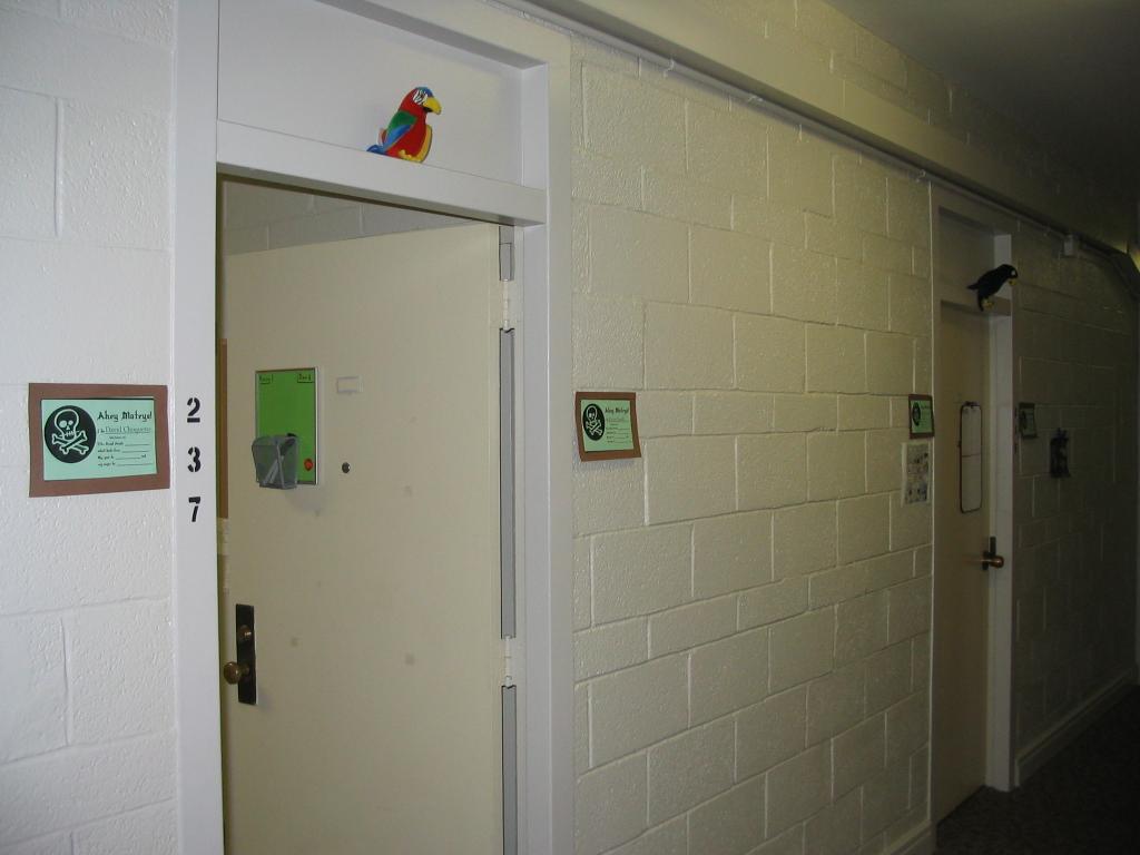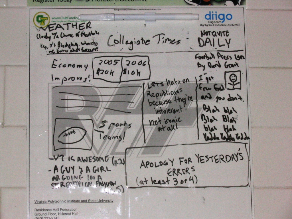 And since each room had a board, we had one board left to spare for entertainment purposes. Here, we were supposed to fill in articles in our version of Tech's newspaper, the Collegiate Times. Starting from the top, these stories make fun of:
