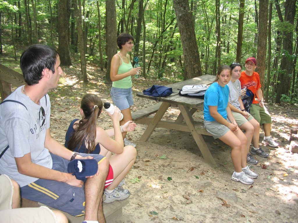 And here the front group takes a break at a shelter on the way. Just remember, under 5, over 20.