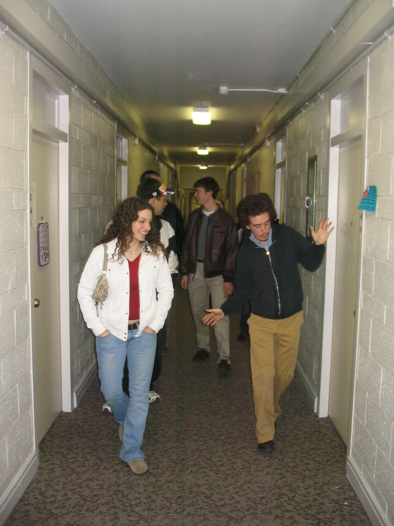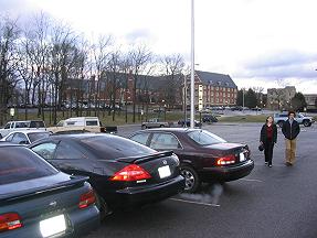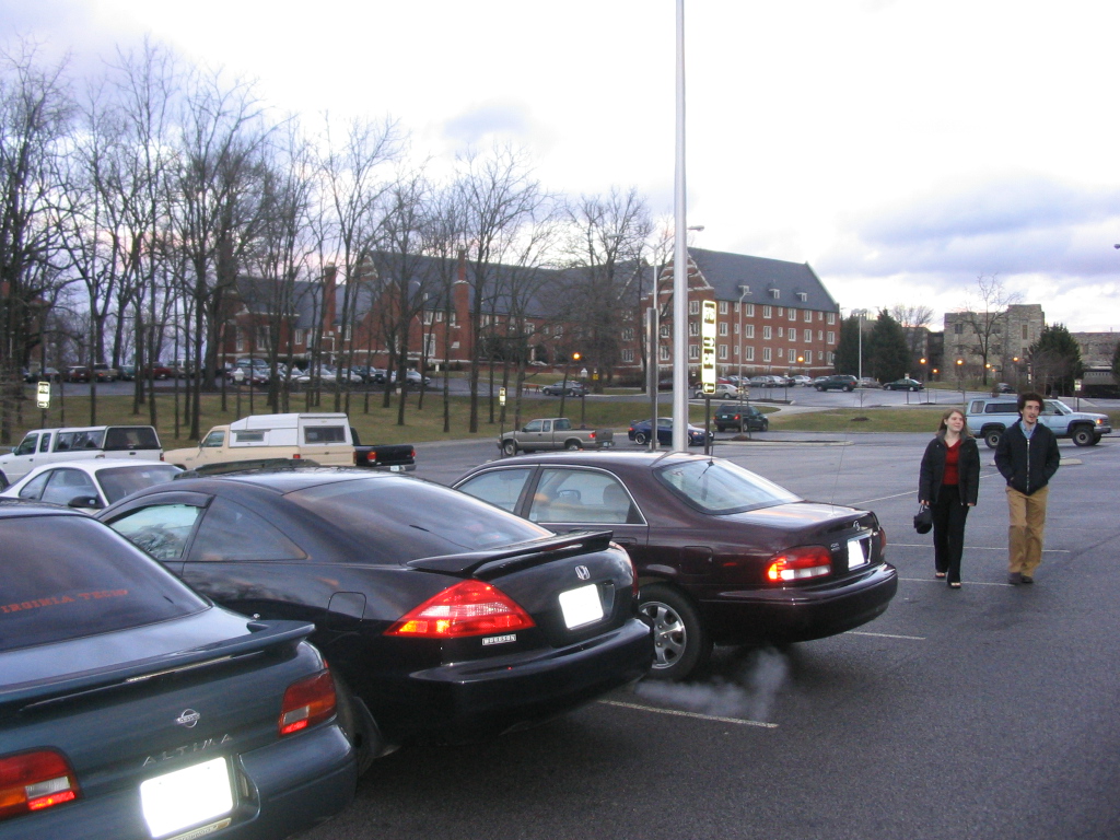 | And now, useless background information. Hillcrest residents can get commuter parking passes. I don't know why, since we're the closest to the residential lots of all the residential buildings, but oh well. So this is how far away parking is from the building. Check out stately old Hillcrest in the background, as Erin and Jeremy walk to Chris' car. |