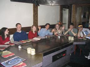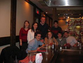 | I'm sure every moderately sized city has one of those Japanese restaurants where they cook you food on a big grill right in front of you at your table. Well, 15 minutes away in Christiansburg, there exists such a place. A group of Hillcrustaceans made a reservation, had an additional space left at their table, and decided to invite me to come along. Here's the crowd, preparing for departure. Check out Jeremy's dance-type routine. | ||