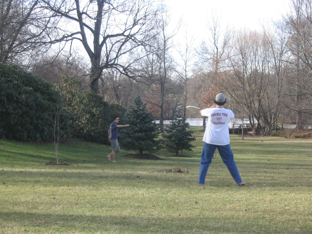 Frisbee at the Duck Pond with fellow Hillcrustaceans! Here's a nice level pass from Jeremy to David.