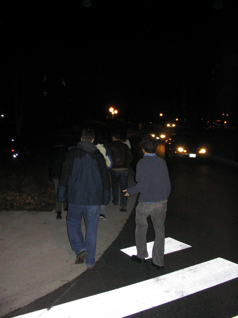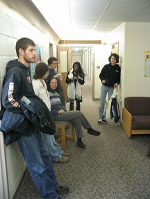 The building's 3rd Floor RA, Rick, went down to the ticket office and was given 20 tickets... in the front 3 rows of the far right section. So on the Monday evening before classes started, 1/5 of the building headed down to Burruss Auditorium for the program. Here, people get ready to head out. Except Steve, as evidenced by the lack of shoes. |