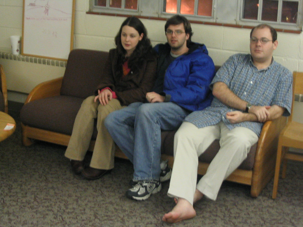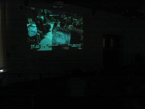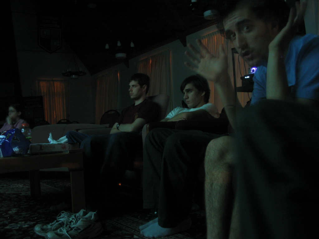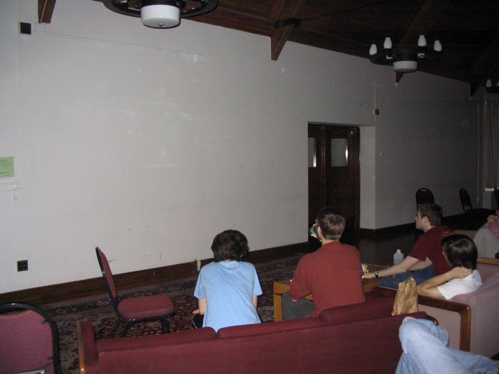 And here's the same picture... with a flash! You can tell now that we use the Hillcrest Dining room, simply hooking up a projector and dragging in a bunch of couches. It's the largest blank, white wallspace in the building. |
