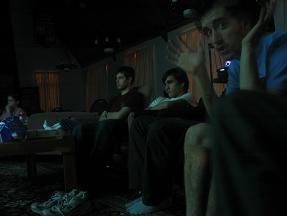 | It was dark in there. So here's a 15 second exposure of the people watching. Good thing couch potatos are a stationary people. I don't know how Jeremy managed to catch on and sit that still in that exact position for that long. This picture was taken at 1:00 AM, with about half of Return of the King to go. |