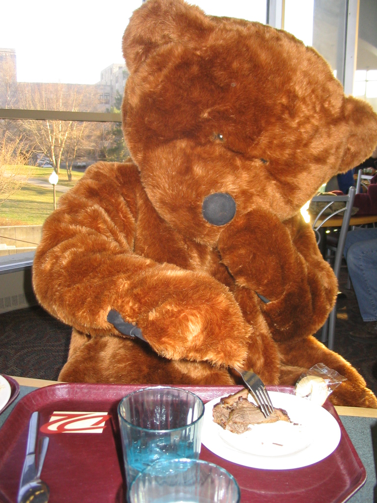 Here, Bear devours his meat after tackling the challenging hummus. | |