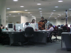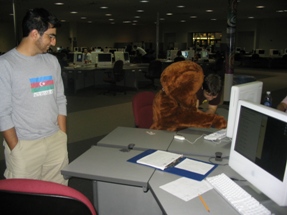 | Greg helps Bear log in to the system while Sam looks on. | |