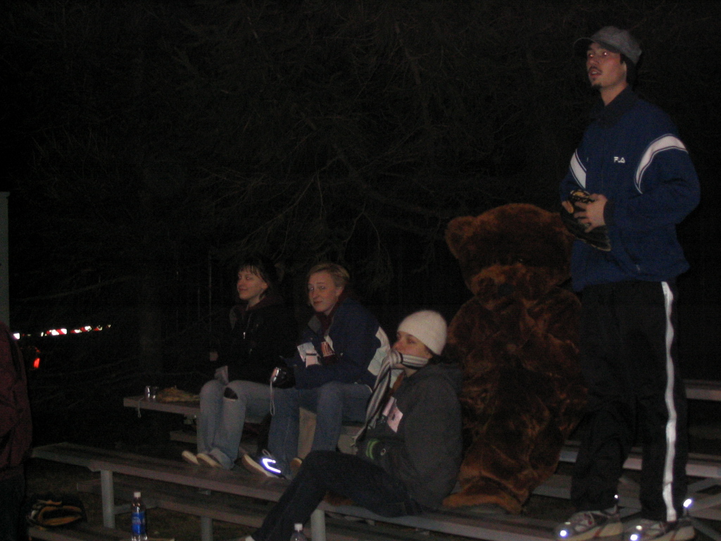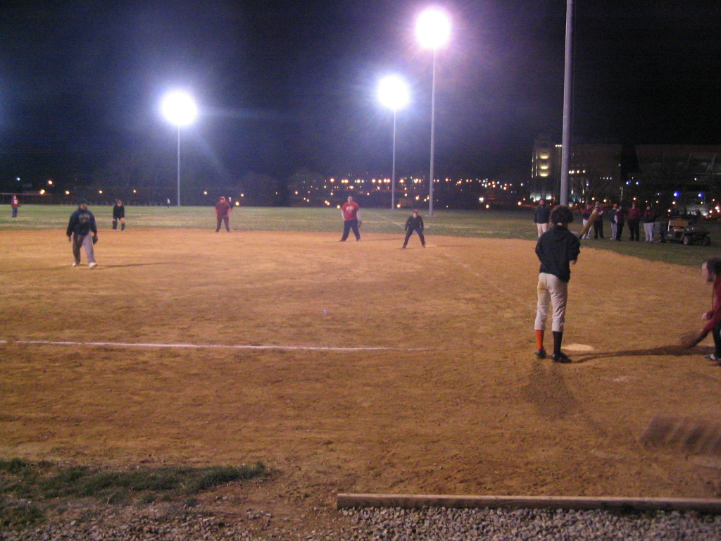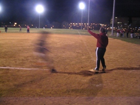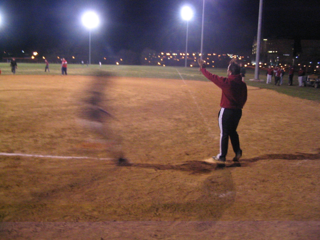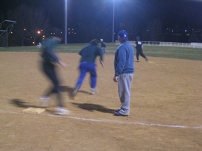 | ACTION SHOT! Team Co-Captian Daniel makes it to first, and Pete decides that now would be a good time to start running. |