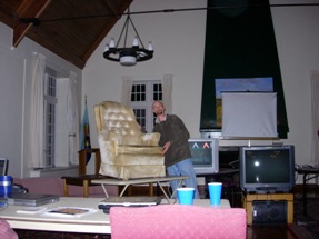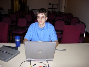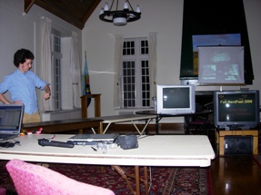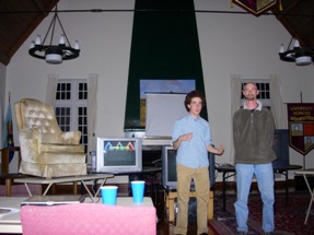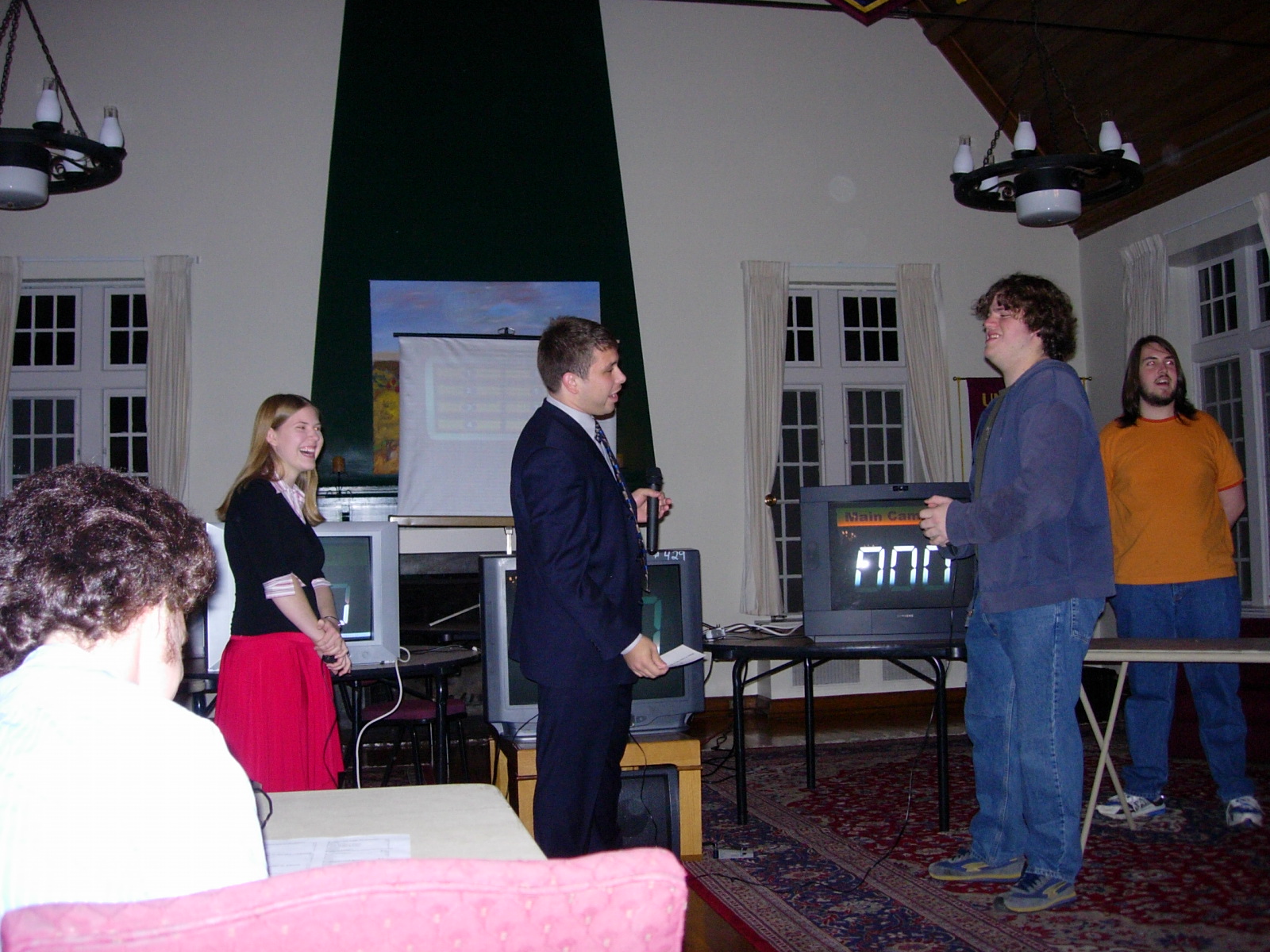 Here, Jeremy checks the time as he puts the finishing touches on the physical arrangements. 3 TVs, 1 projector and screen, 1 academic bowl buzzer system, 1 kickin' speaker and wireless mic system, 4 laptops, 1 VCR, hundreds of feet of cables: check. |