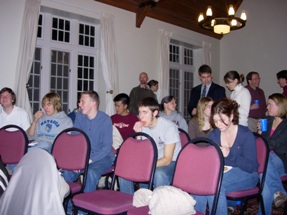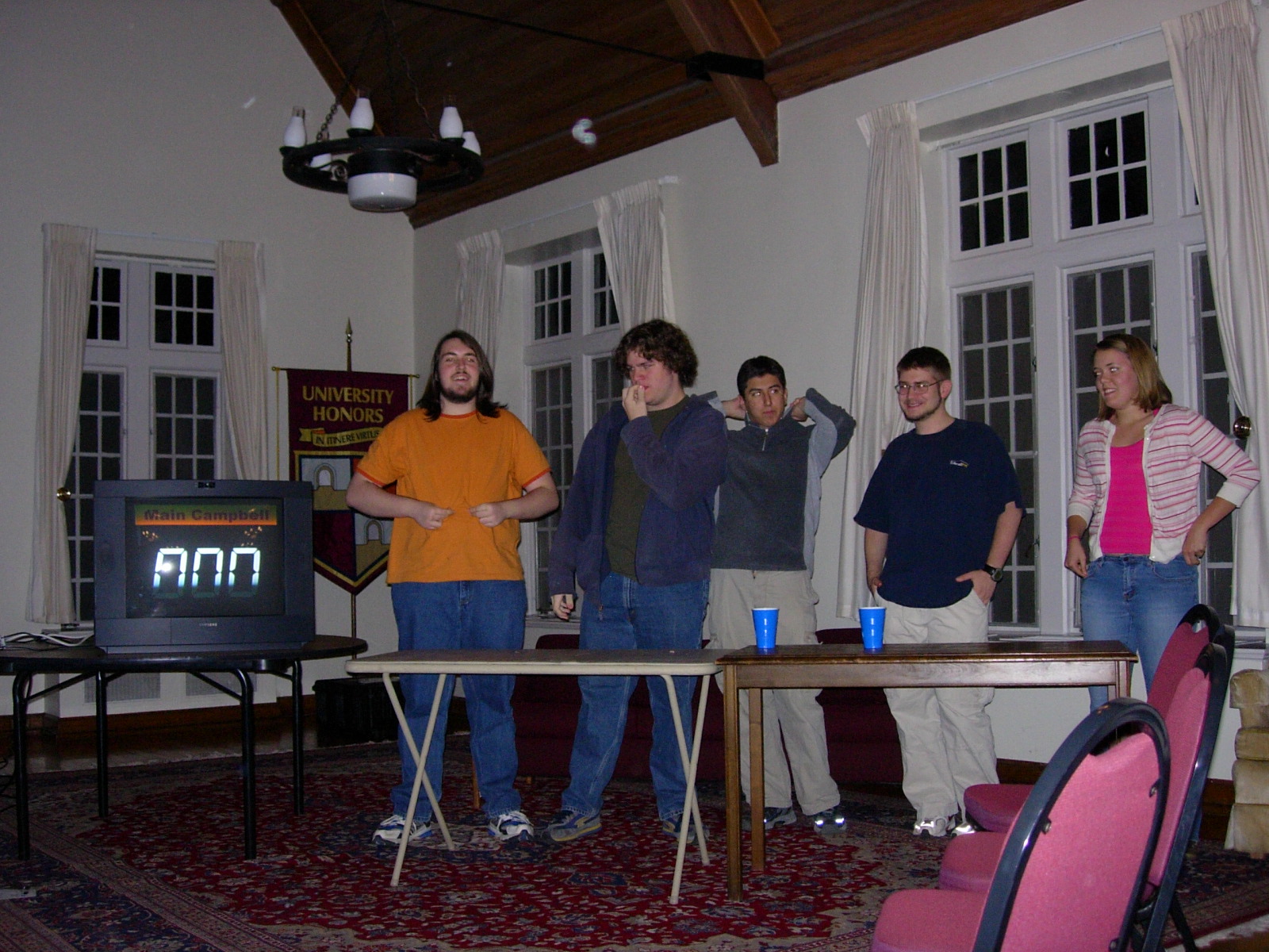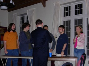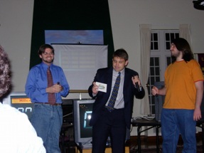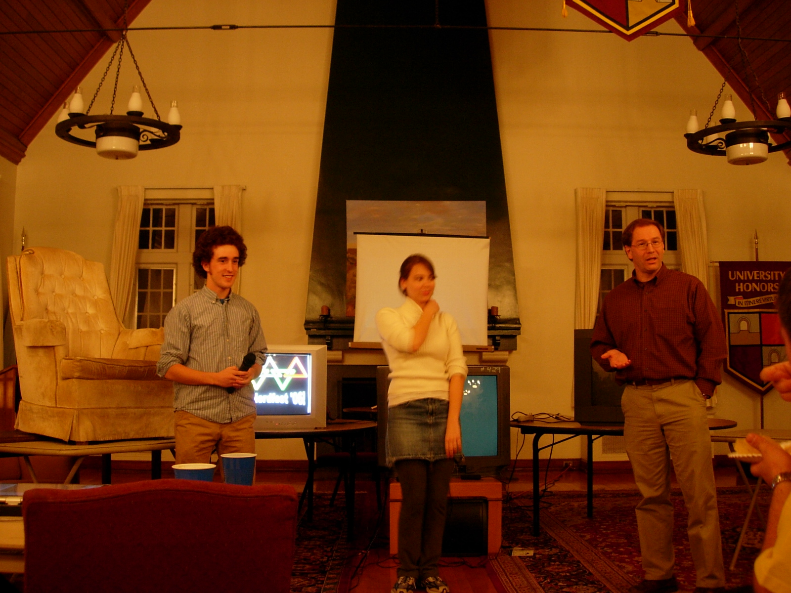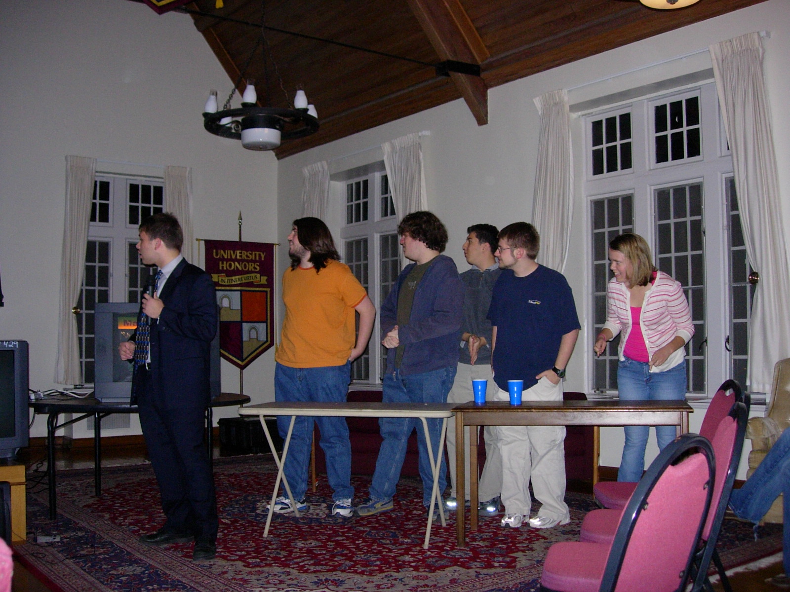 Originally, the plan was to get a member of the Honors staff to host the event, in the interests of impartiality and all. However, after a test run at the first fall coffeehouse (about halfway down this page), we found out that Second Floor Greg was the perfect match for the job. Here, he gets jiggy with the Family Feud theme music as the team captains look on. | |
