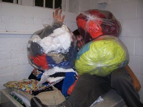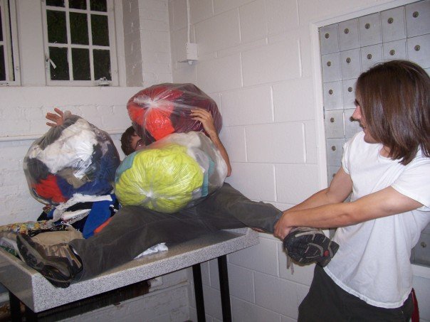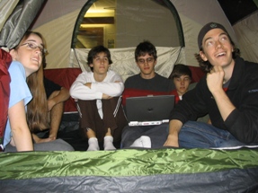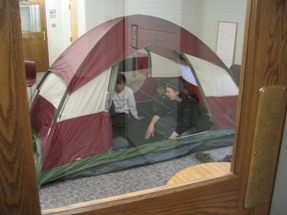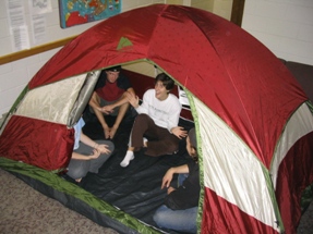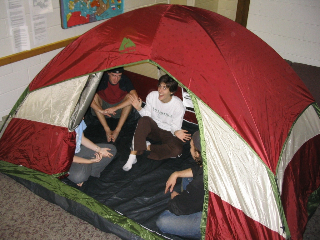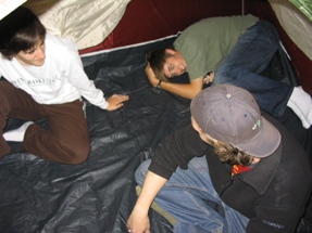 Here, Mitch demonstrates how we can fit 15 people in the tent by packing everybody in efficiently.