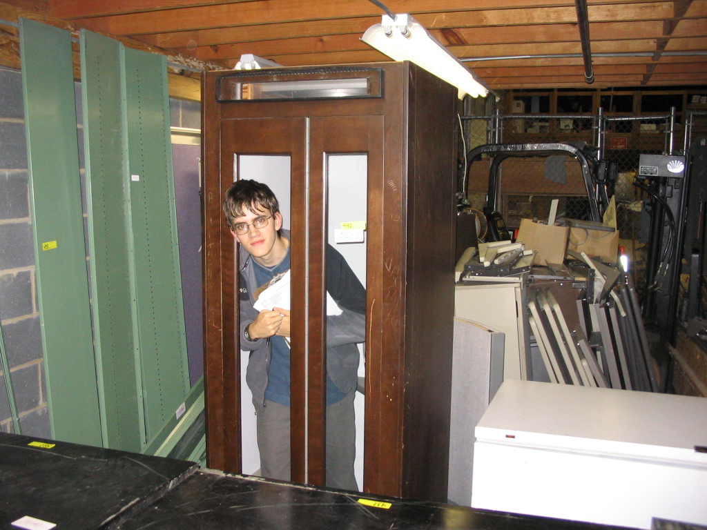 The great thing about the surplus auctions are the random items they sell. Last semester it was the dump truck, last month it was the 200 coffee cups for $5 and the forklift, and this time it was the "Phone Booth (Old)." Here's what it looked like. It actually had a pay phone inside but was in pretty rough shape. As you can see here, it was missing a pane of glass. We didn't think it was worth buying, but obviously somebody did since it wound up going for $500.