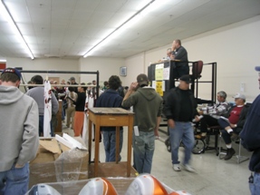 Look at those auctioneers go! They were on a big cart with battery powered speakers and just rolled down the length of the building as the 700-some item auction progressed. You can also see the guy with the little cart complete with battery powered computer and wireless router to transmit the results back to the front desk/cashier. Anyways, here's what the auction sounded like presented as a hube (14MB) WAV sound file.