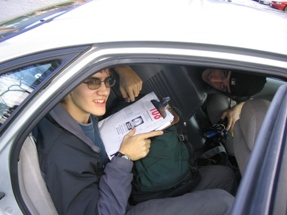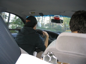 Driving Back! Jeremy's seat is currently holding the TV in place, which made it hard for him to drive without using a low-riding gangster-type posture or hugging the wheel as he is here.
