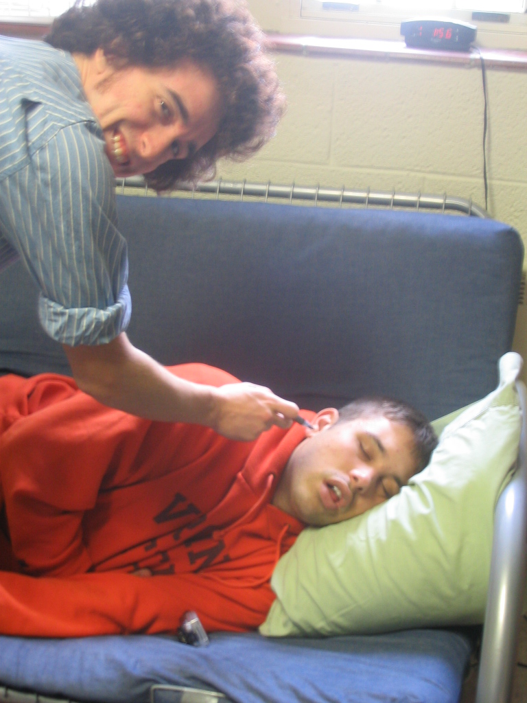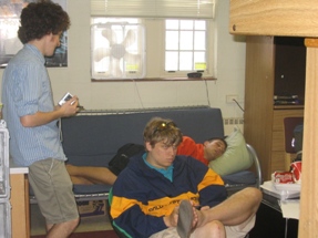 What would you do instead of studying for your exam? Why, draw on the afformentioned person's face with a dry erase marker, of course. And Jeremy's going to be an RA next year. For shame. And Greg... well, I suppose he'll be the same shoeless Steelers fan he was last year. | |