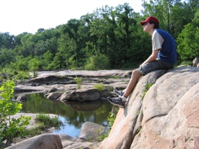 | I decided to take advantage of my week and a half long break before I had to start work again to visit a few cool spots around Richmond. Here, I'm in the heart of downtown, on the southern side of Belle Island. Up until the 60s, there was a hydroelectric power plant complete with some short dams to power streetcars in Southside. On this side of the island, the dams are still holding and allow all of these giant rocks to be exposed, allowing you to "rock hop" all of the way across to the island. See a picture here. Sure, it looks kind of dull, but it's actually a fairly cool place, especially when some VCU students are playing some groovy bongo drum music up the river someplace and it's echoing all around and the sun is shining, and there's a slight breeze, and the sewage treatment plant downstream is turned off. | ![]() |
