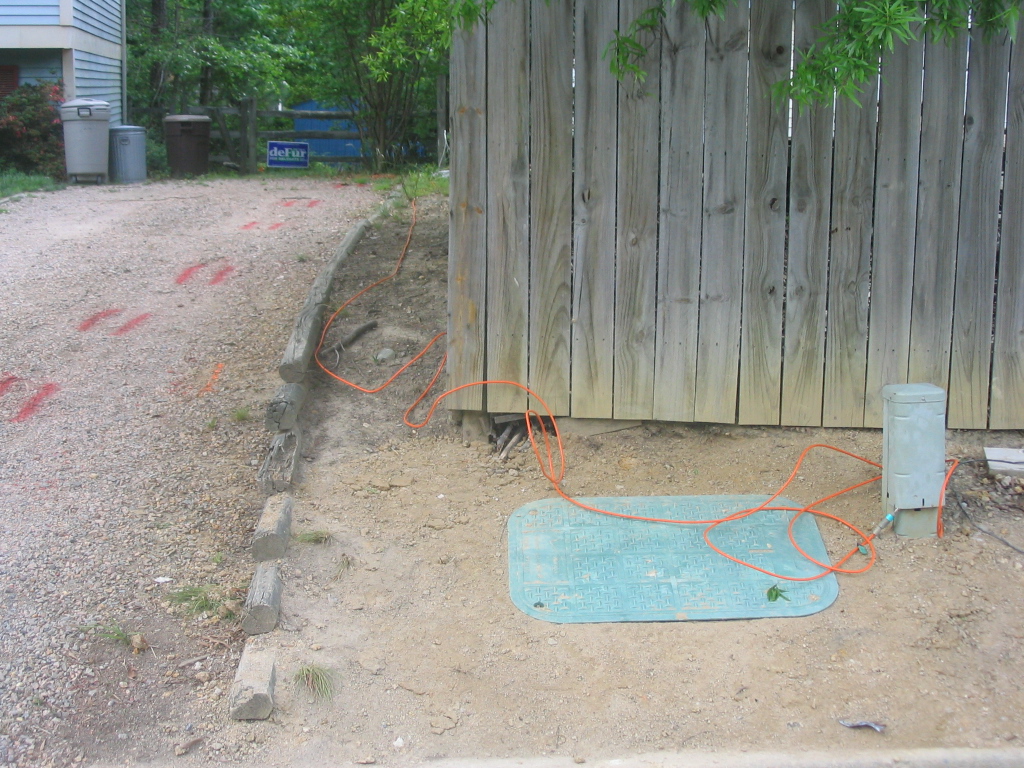 We're getting fiber optic cables installed in our neighborhood. I don't know why, nobody has that good of a connection, but anyways, during the digging a contractor cut off our cable (TV, etc.). So while all of the involved parties bickered about who would need to do the permanent repairs, Comcast (I think) was nice enough to run this jury-rigged cable down our driveway and into a slightly underground plug that I'd never seen before. Problem solved. Well, I though it was funny. At least at the time. |
