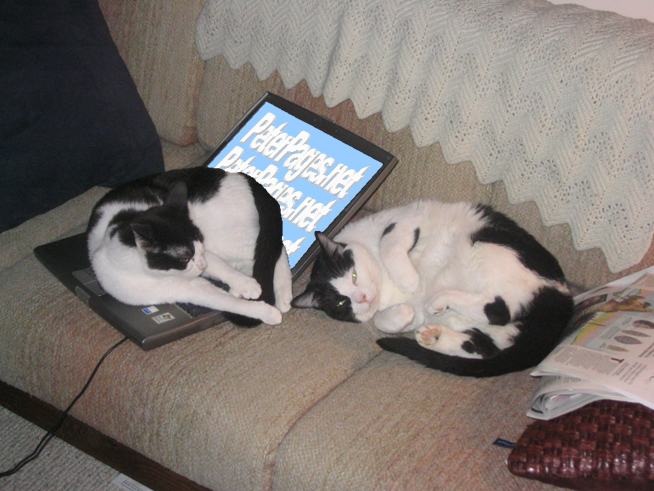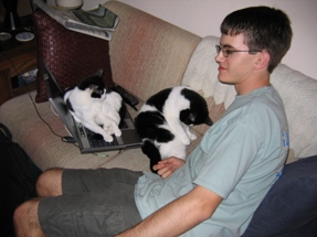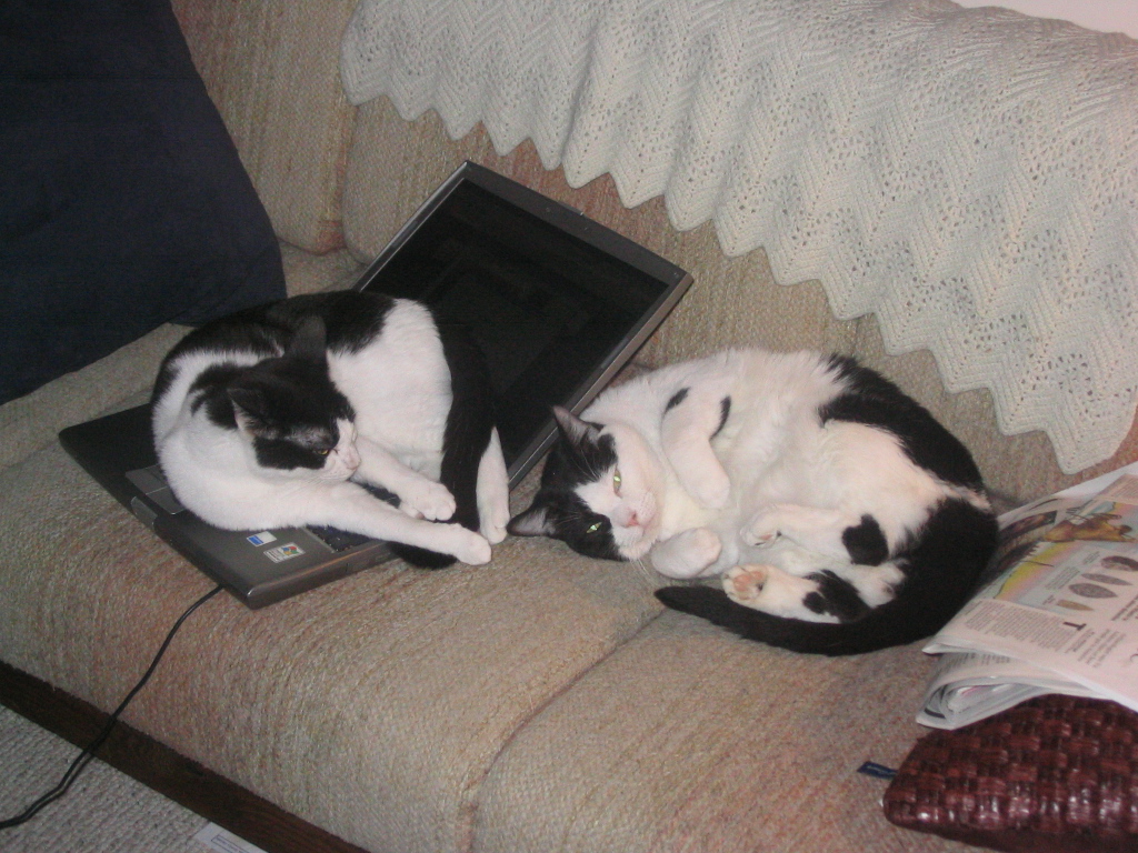 | Aww, they just look so relaxed. Tsali (left) wanted to help catch some viruses while I ran the VT Symantec virus thing (or was just cold) and Sprocket (right) looks ridiculous as usual. | ![]() |