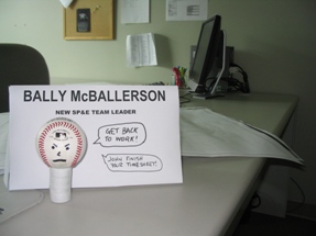 Like this baseball. Add some permanent marker, and you've got a temporary replacement. These two quotes pretty much sum up Tim's job. But that's not to say that I haven't added my own personal touches. You can see the No Loafing sign in the background of the above picture, and there's a Demotivational Poster in the background of this photo. |