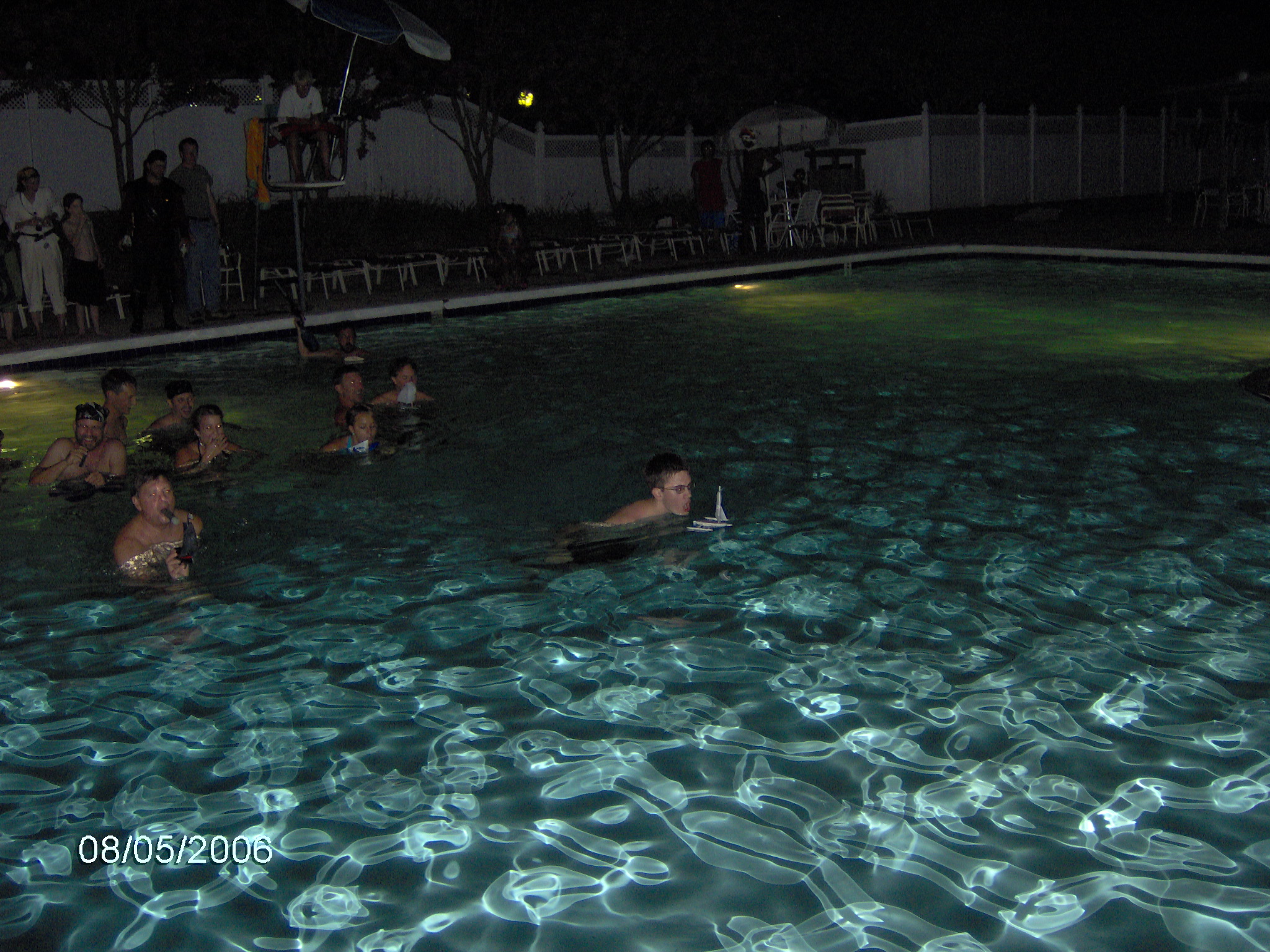 | And at the end of the summer, my work decided to hold some sort of office party. They also had a contest using the same kits as the raingutter regatta event from my Cub Scouting days. One of my coworkers put the thing together with some spiffy outriggers and painted it Primer White. It wasn't anywhere near as outlandishly decorated as the other boats, however, it was very streamlined and Americas Cup-esque. So I managed to win the event. Yay. Actually, I was second, but the guy who beat me is the guy on the left of this picture, and as you can see if you look closely, he is carrying his boat in this shot. So boo yeah. | ![]() |