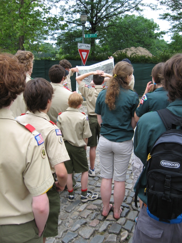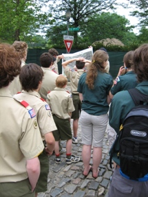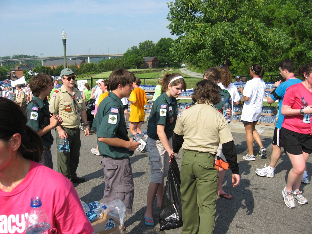 | People from about 5 different troops/Venture crews were there. My mom and I wore the snazzy green shirts of the Venture uniform. People seem to trust you if you're wearing the same type of shirt as everybody else in the group but it is a slightly different color, as all the passing motorists kept asking me where they could park. Notice the storied cobblestones of 5th Street. Ooh, ahh, we're all historic here in Richmond. | ![]() |