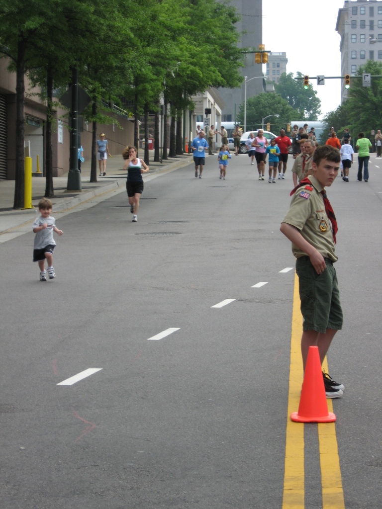| Due to road construction, I had to do stand around in a different place than usual to help staff the Kids' Run. The kids ran up 3rd Street, where a crowd of people turned them around before they ran into busy traffic, and then they ran back down the other side. We all got to stand in the road and act as glorified cones. Note that all the kids are number 1, literally, according to their number tags. | ![]() |