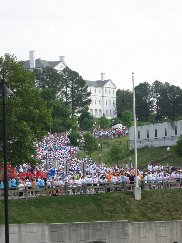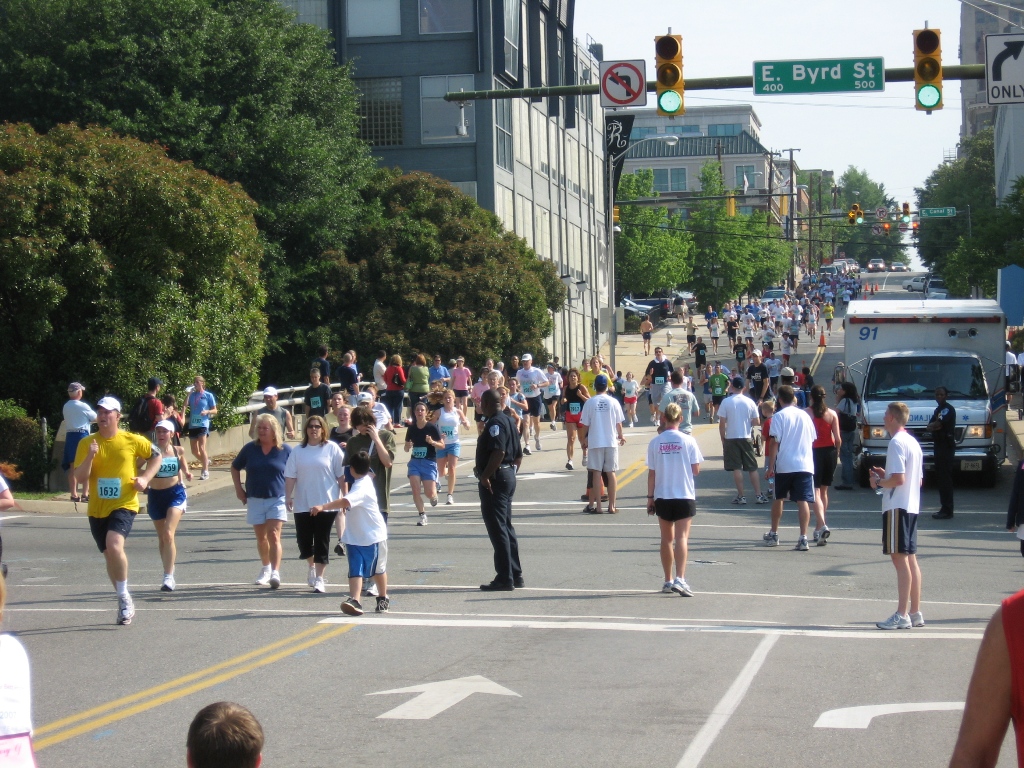 The people come down 7th street into the finish. The blue tags are for people who are actually racing, but as you can see there are already a great deal of people who finished and are walking back up the hill to their cars. | |