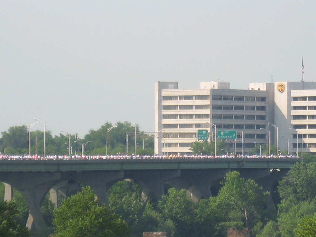 | The course takes people down one bridge across the river, over a few blocks, back another bridge, and then they wind around by VCU for a few blocks. After the first thousand or so runners, it's pretty much just a mass of people bobbing up and down and marching on over the course. I wanted to get a picture of that up close, but they put us in a different place this time, so this is the best I've got, from across the river. They filled up a good 3 lanes of the Manchester Bridge | ![]() |