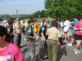 | Then it started getting hot. We handed out hundreds of flats of water to people as they finished. After carrying them two at a time up to the finish line for a half hour, they started getting really heavy. To give you some idea of how many people were running we've been handing out water for about 15 minutes to people in this picture. There are still thousands of people on the bridge in the background, at about the 3k mark. We were there for quite a long time, and nearly ran out of the water, some of which you can see in the background. | ![]() |
